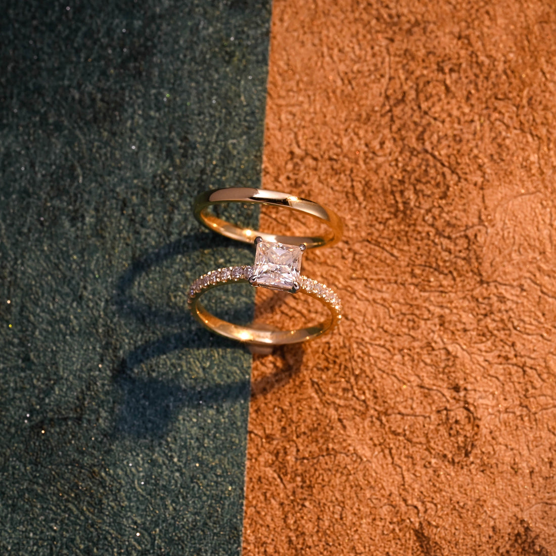Solid Gold Princess Cut Moissanite Engagement Ring Set, Classic Promise Ring Set, Bridal Ring Set, Art Deco Ring, Gift for Girl, Woman, Wife