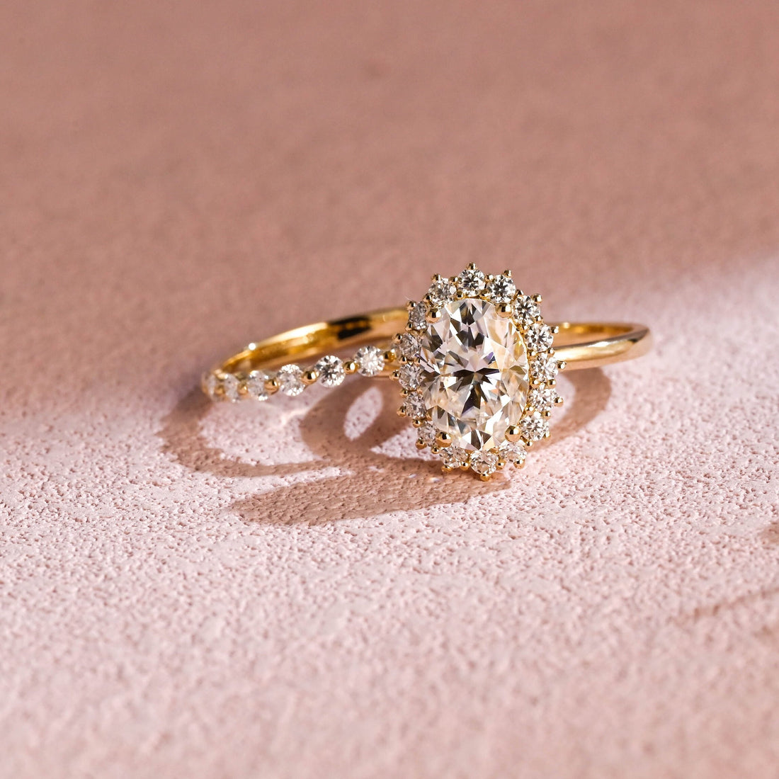 Oval Cut Moissanite Engagement Ring Set, Solid Gold Wedding Ring Set, Art Deco Halo Ring Set, Vintage Bridal Set, Anniversary Gift for Woman