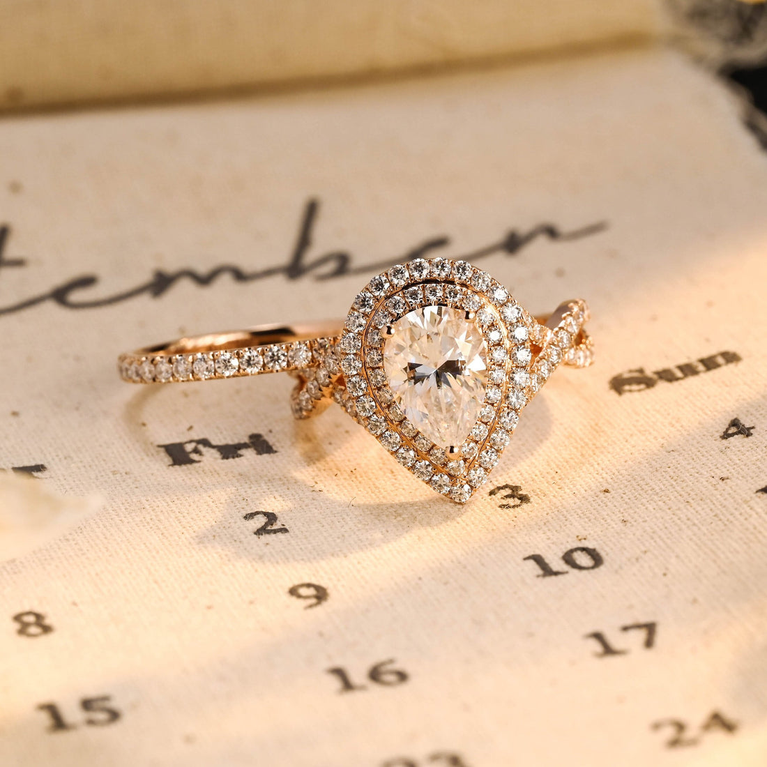 Cross/Twist Shank Pear Cut Double Halo Moissanite Engagement Ring Set