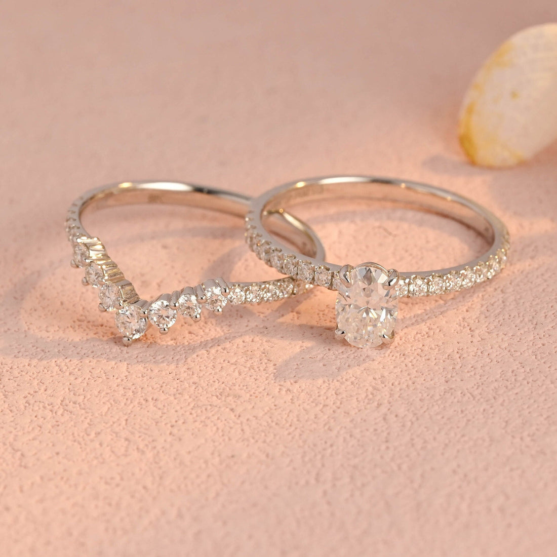 1ct Oval Moissanite Bridal Set, Classic Oval Pave Moissanite Engagement Ring Set,Round Curved Vintage Moissanite Ring,9K White Gold Ring Set