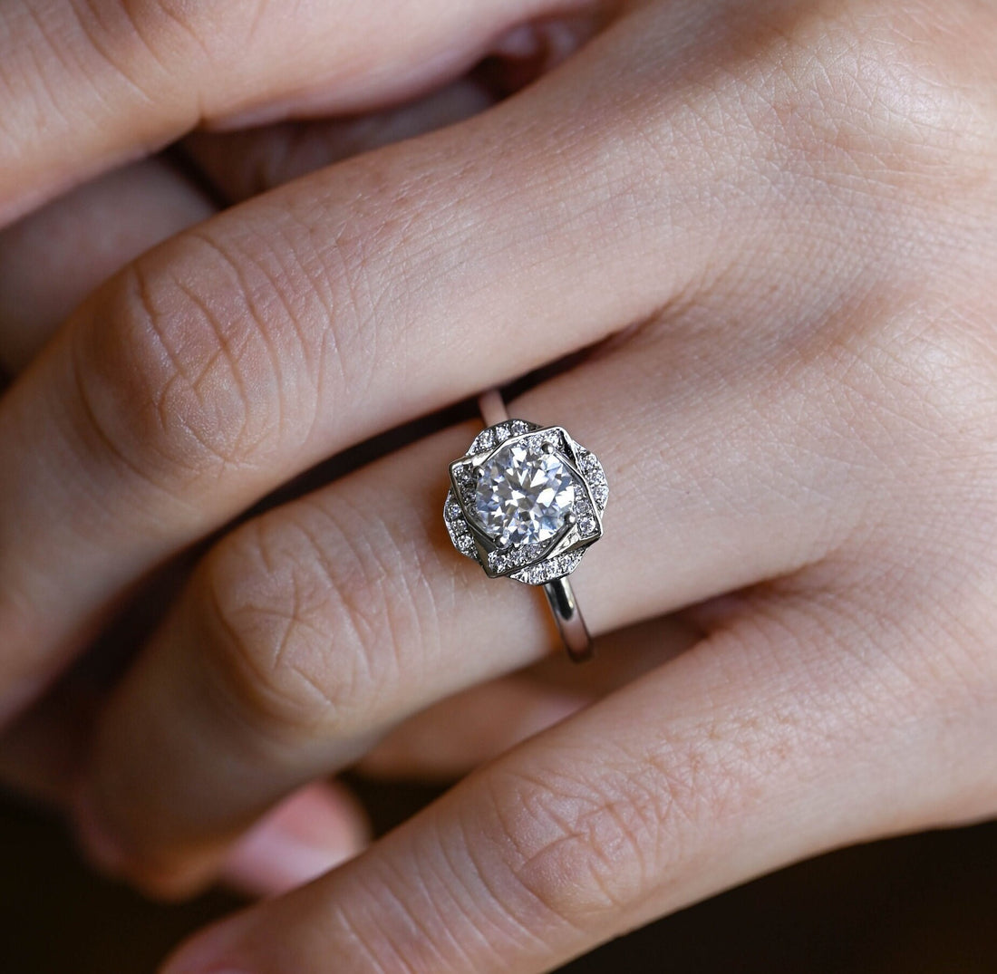 1.00ct Rose Floral Round Halo Diamond Engagement Ring, Rose Halo Round Wedding Ring, Valentine's Day...