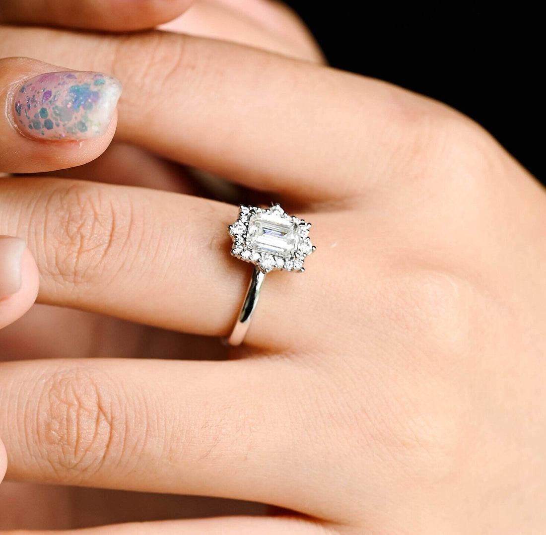 3.5ct Vintage Halo Emerald Cut Diamond Engagement Ring, Emerald Diamond Proposal Ring, Anniversary Gifts for...