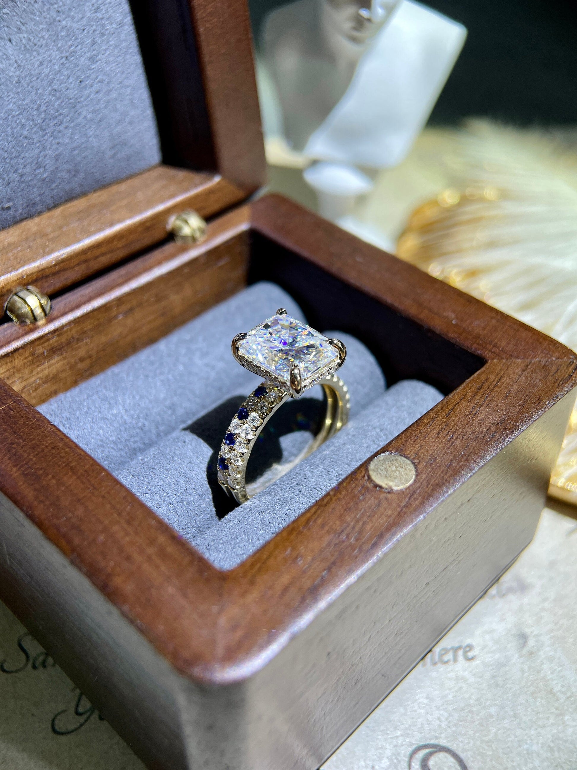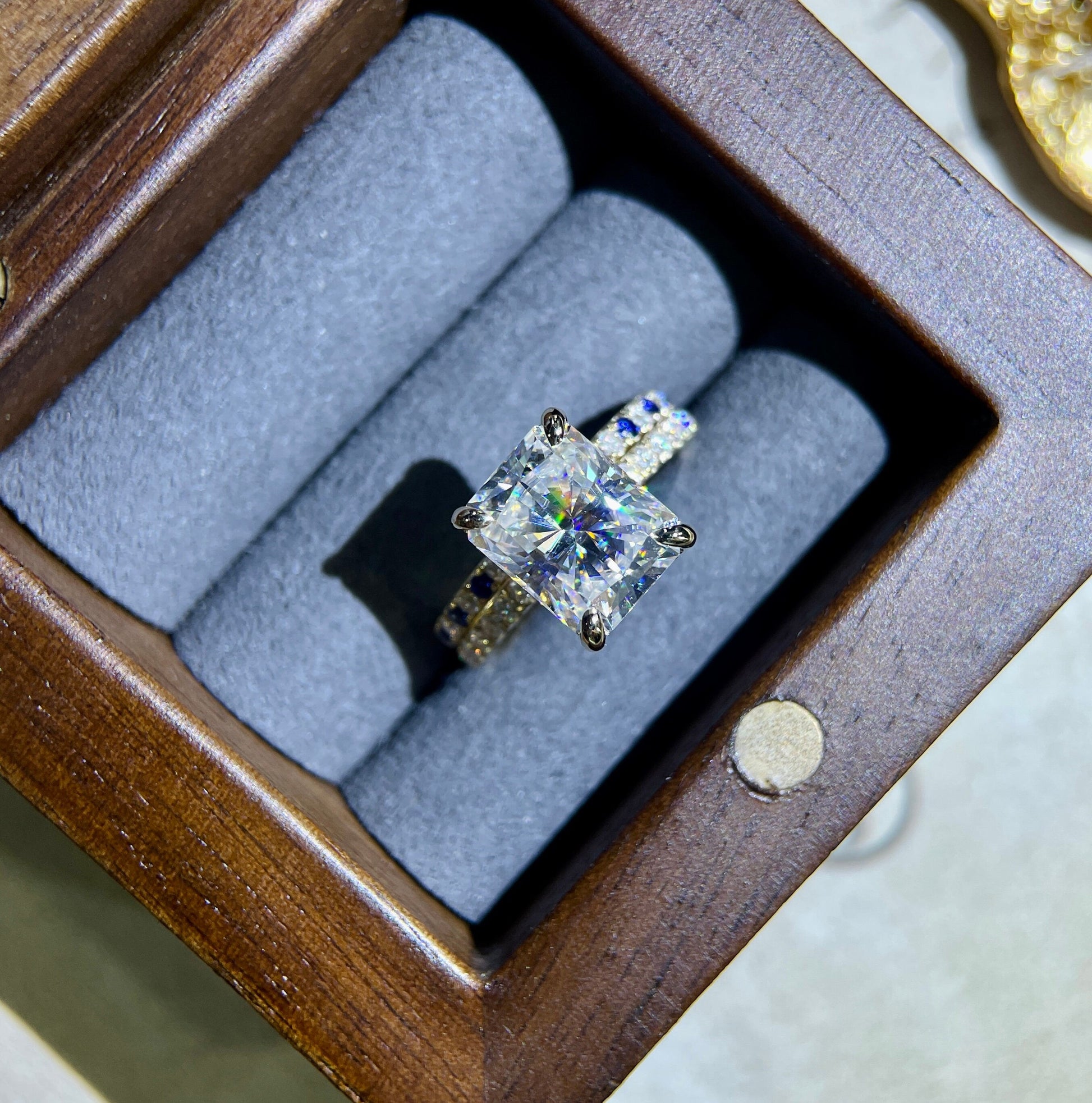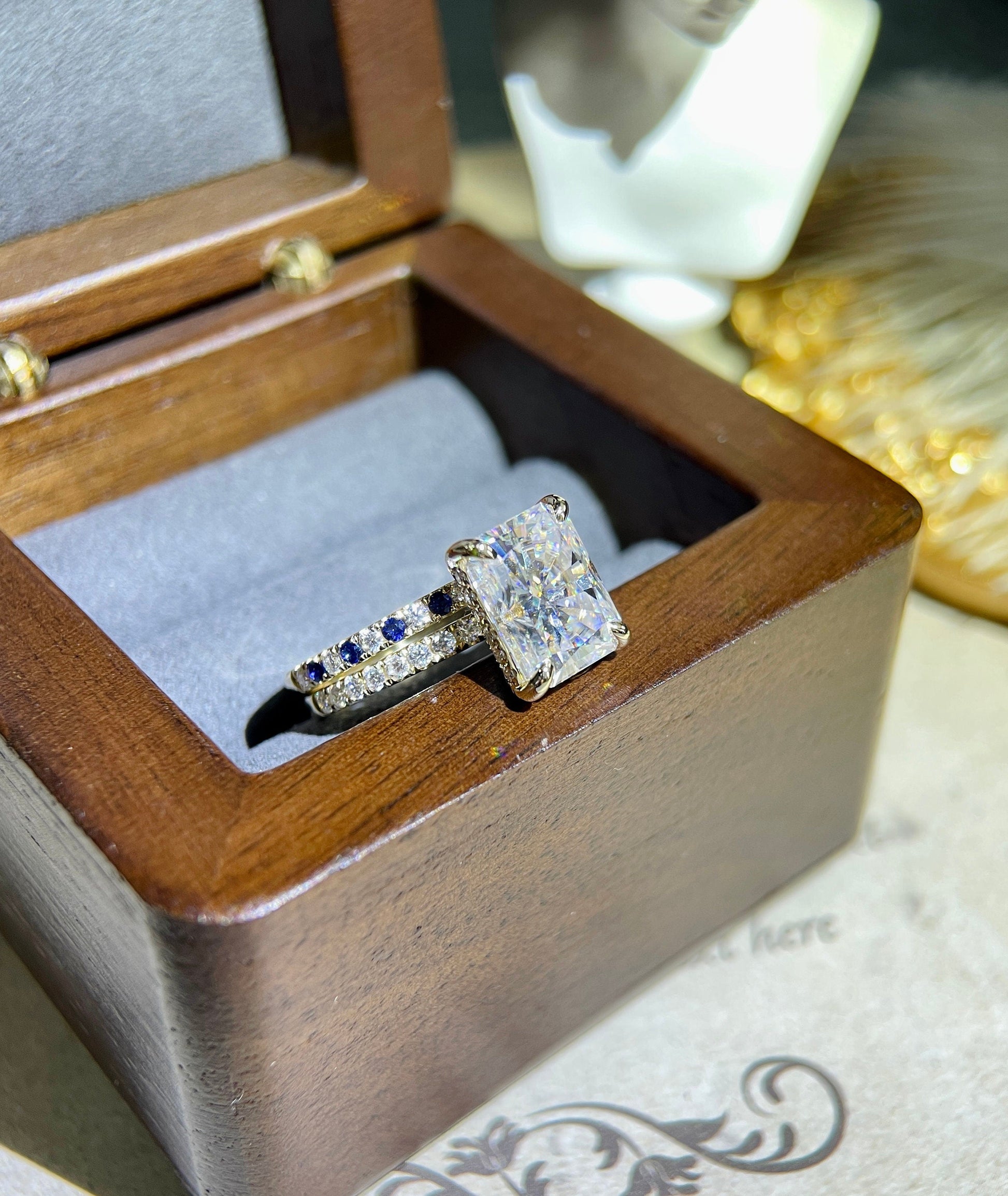 4CT Radiant Cut Pave Hidden Halo Moissanite Engagement Ring Set/14K Solid Gold Promise Ring Handmade Ring for Women/Sapphire Wedding Band