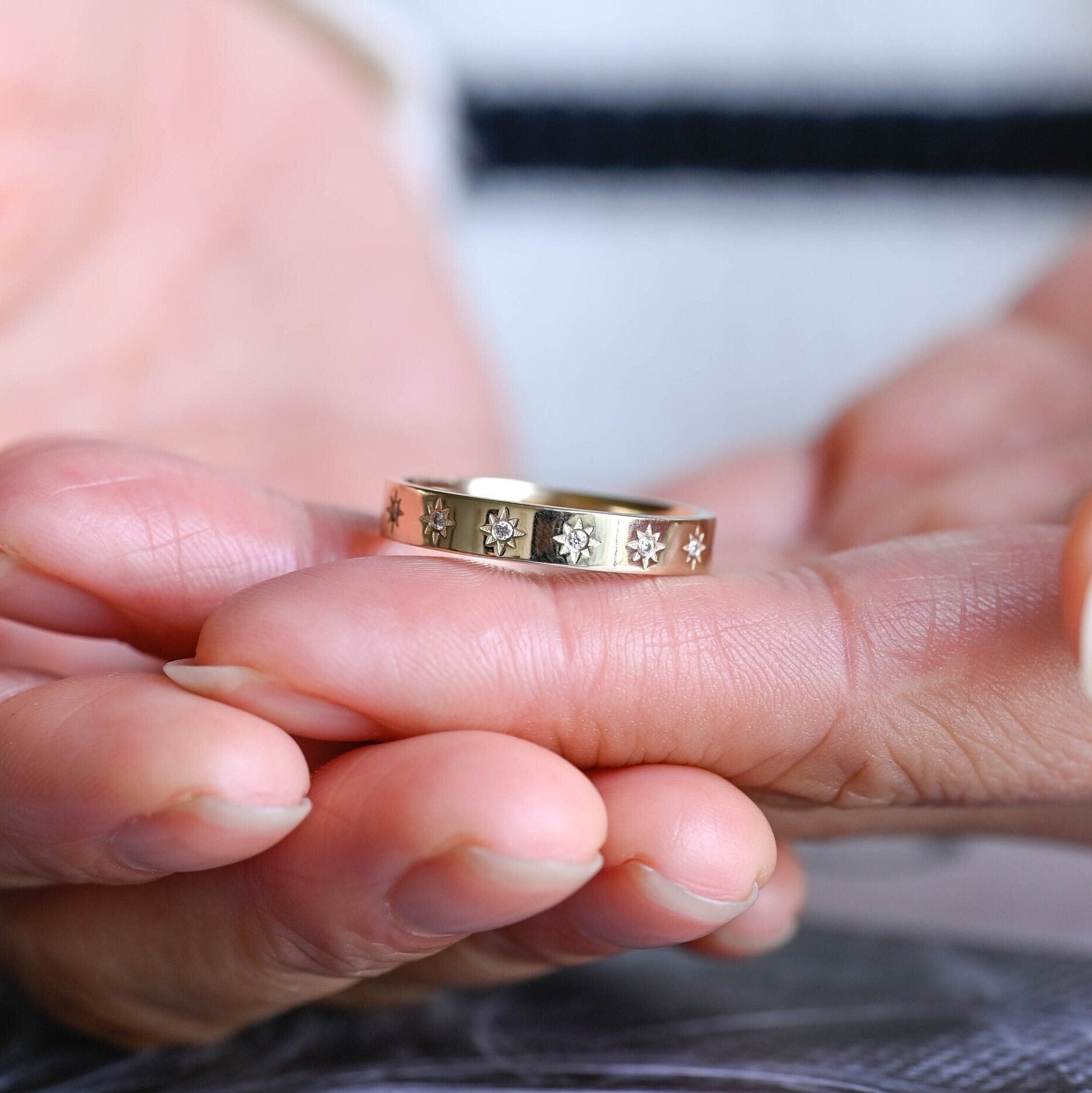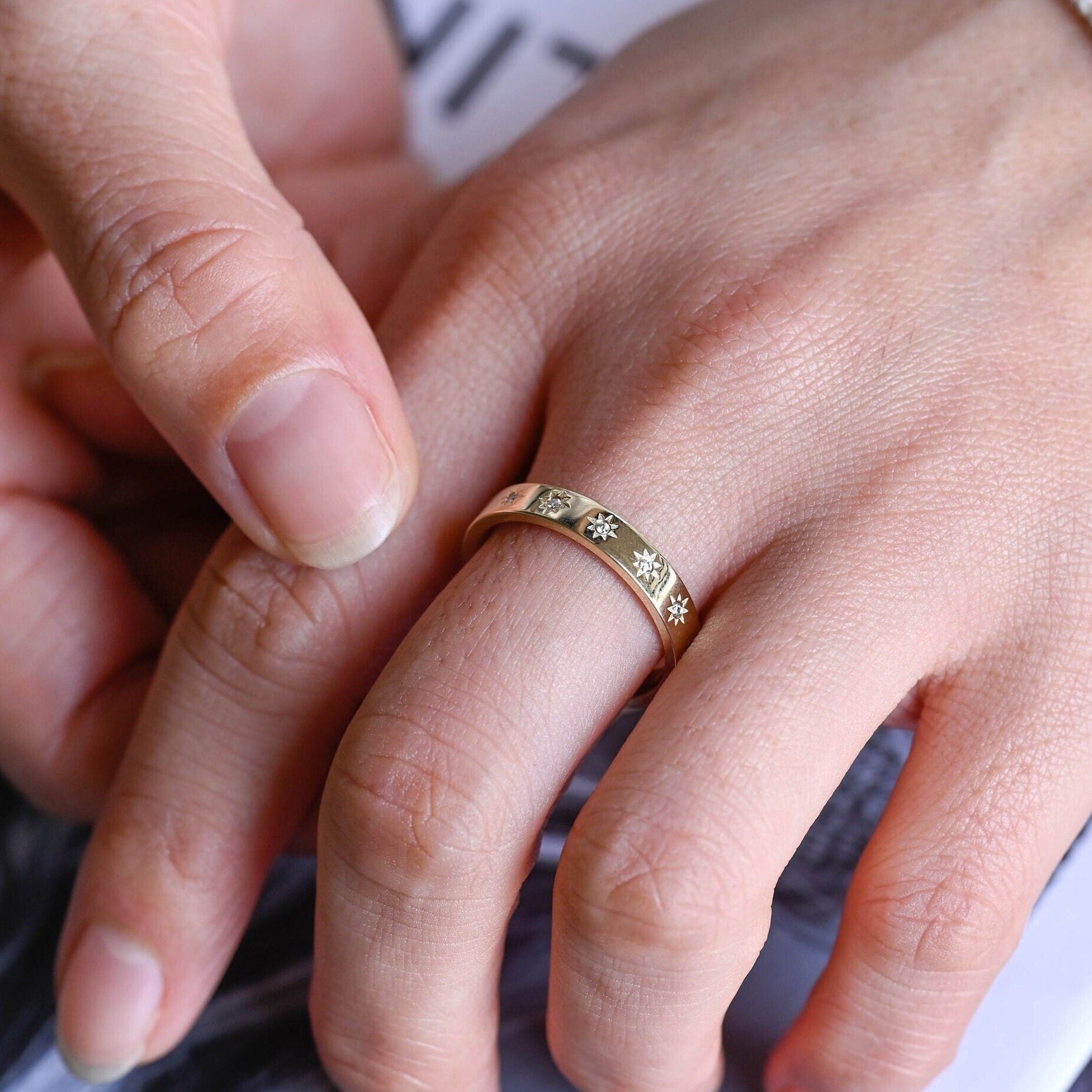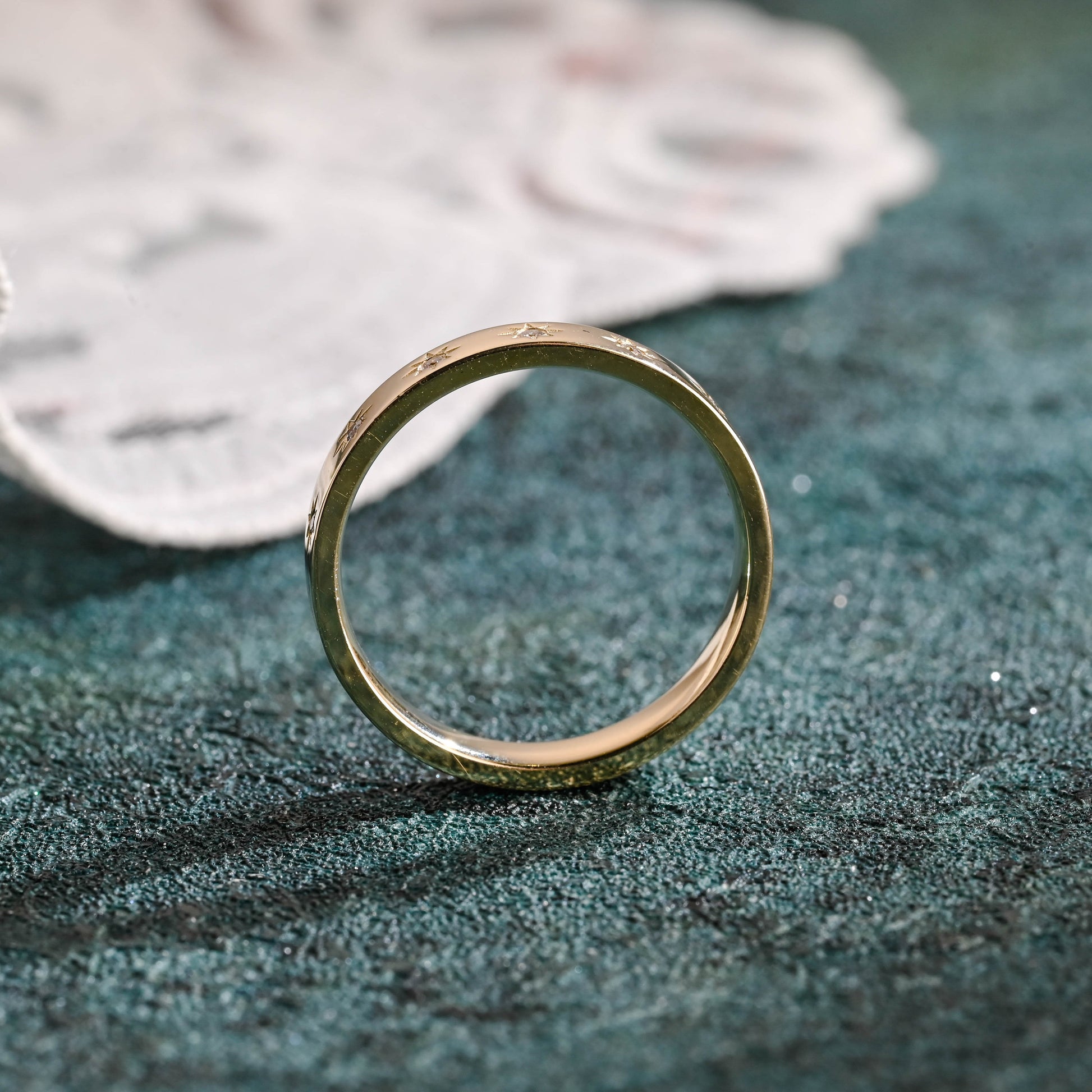 4mm Star Engraved Moissanite Solid Gold Dainty Star Setting Band