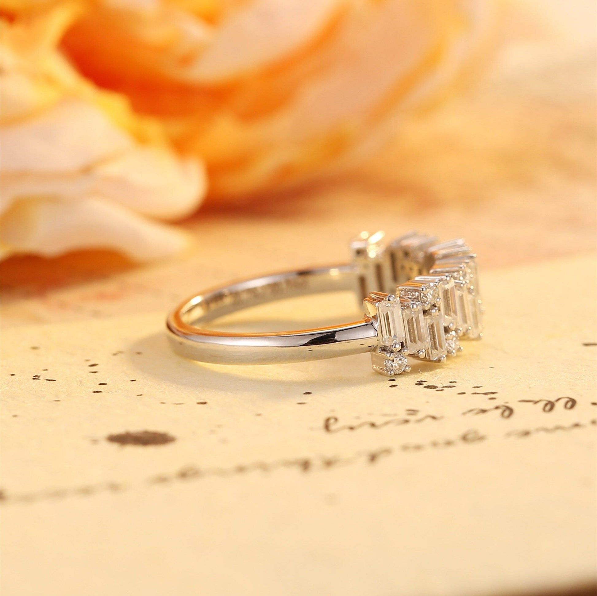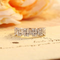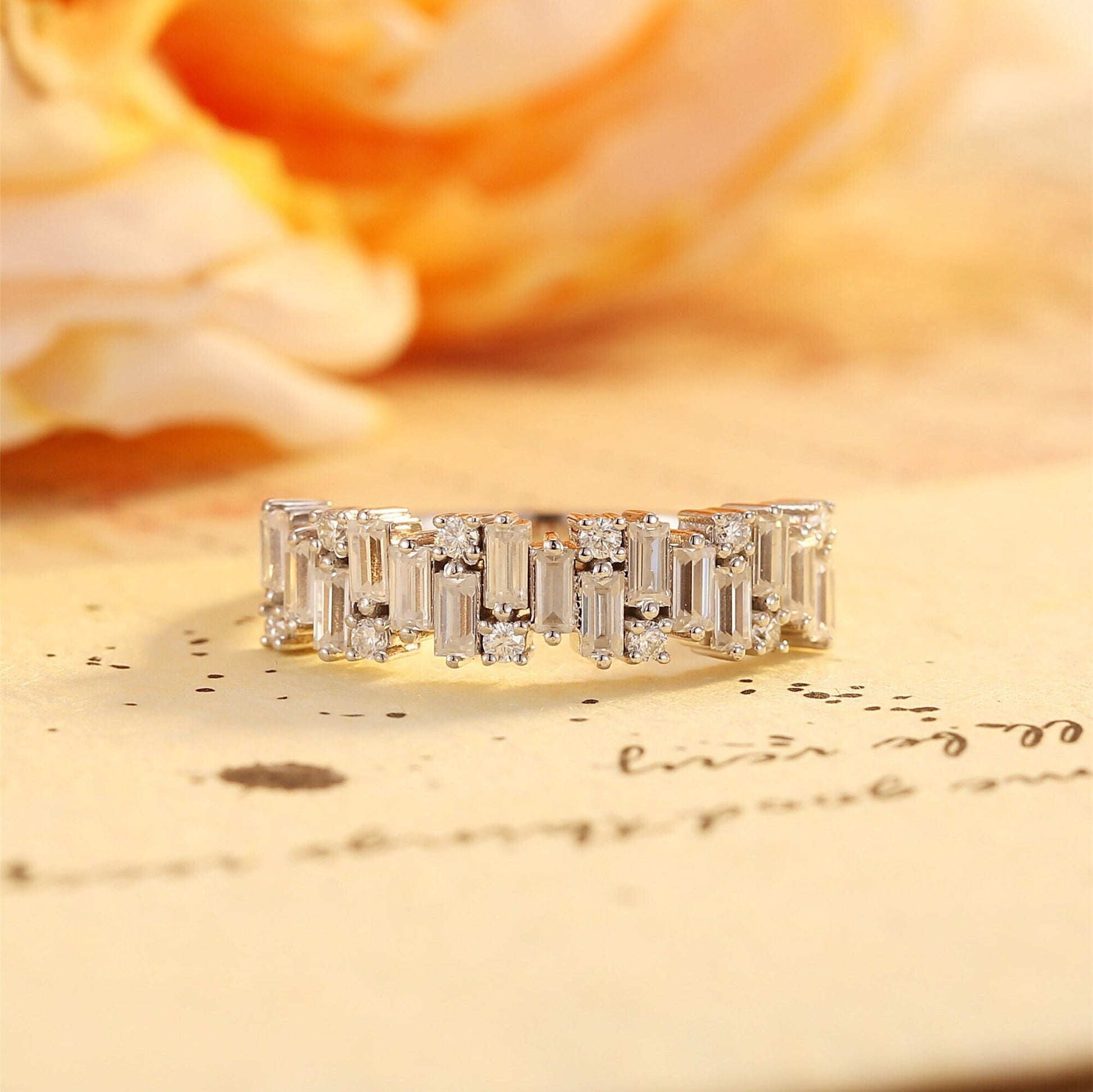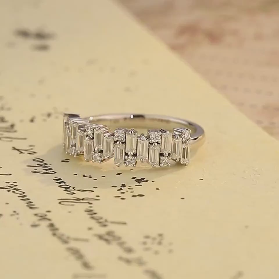 9K/14K/18K Solid Gold Staggered Baguette Ring, Round Cut Moissanite Paved Wedding Band, Half-Eternity Stacking Engagement Bridal Band