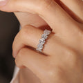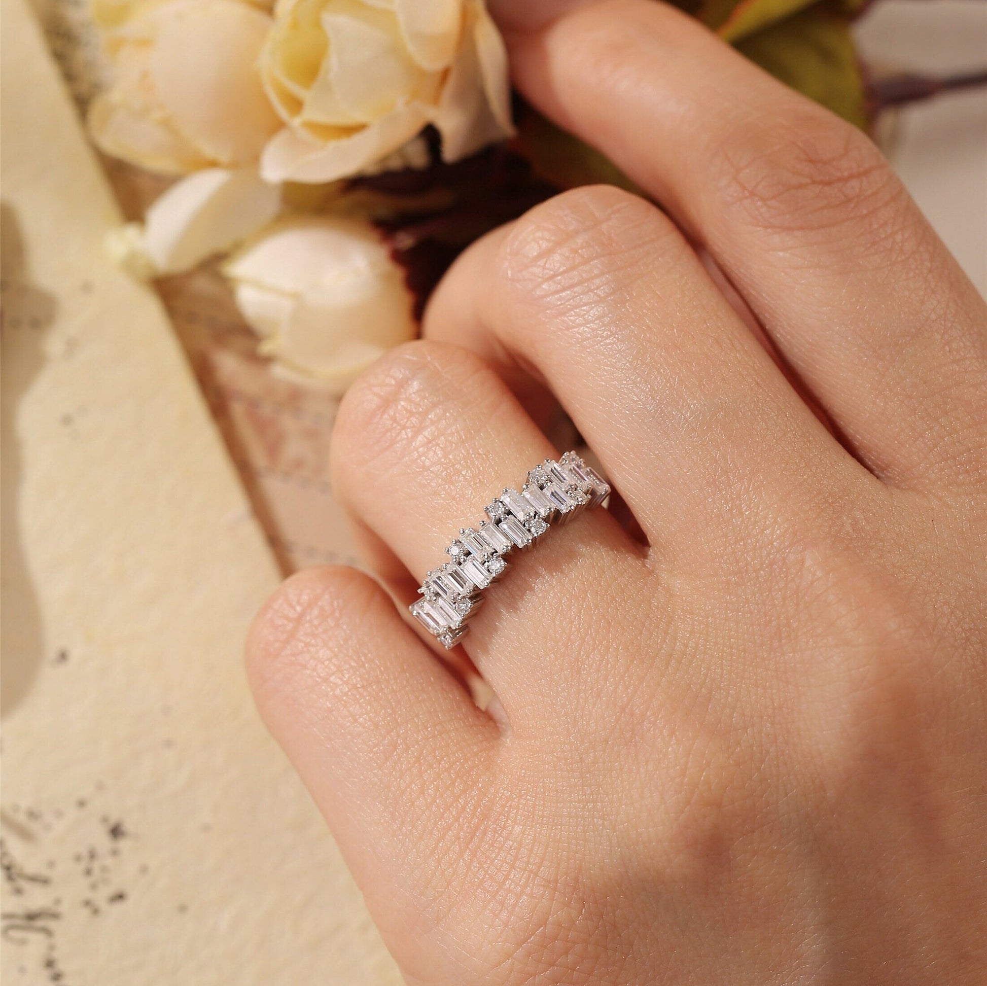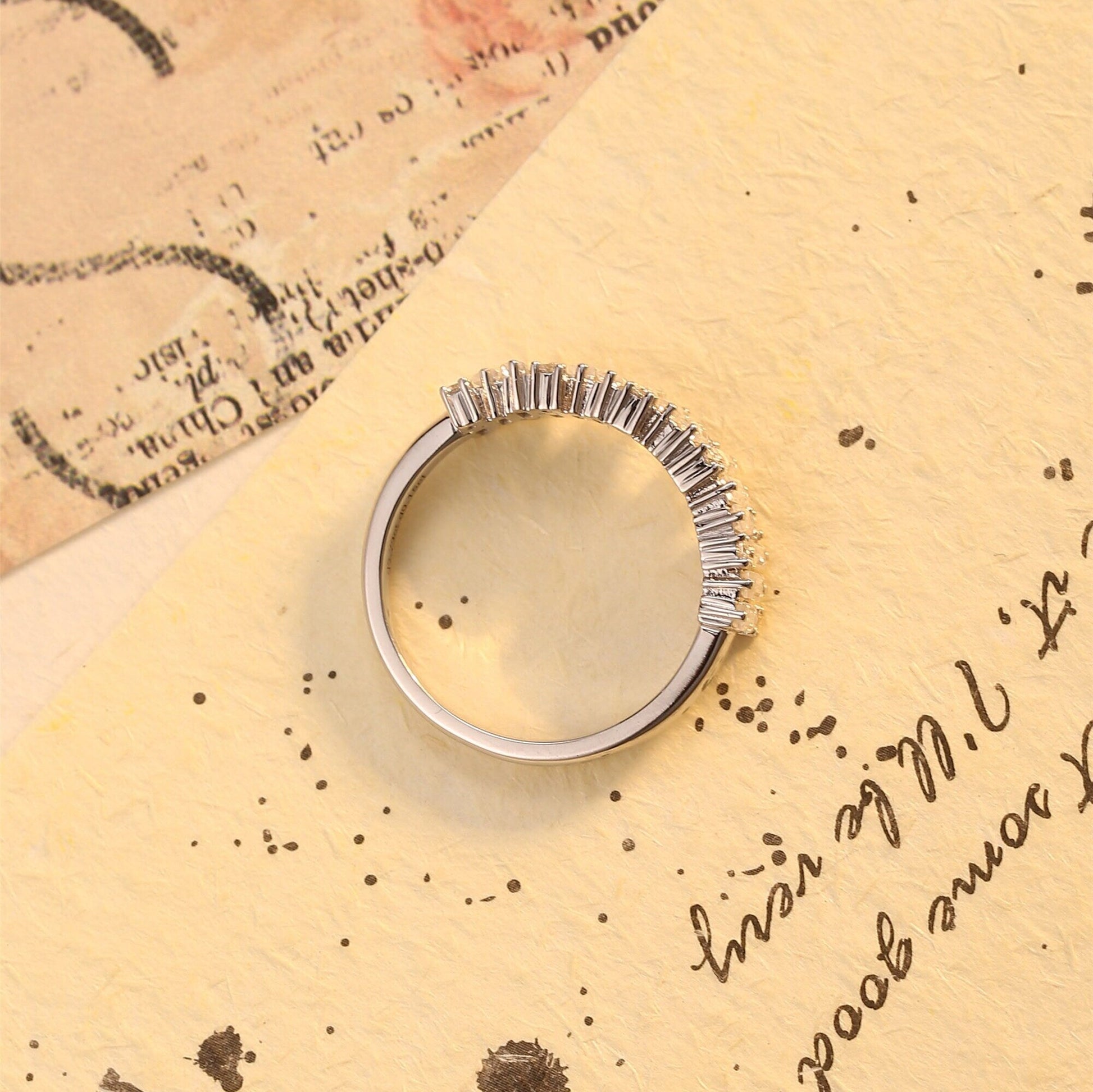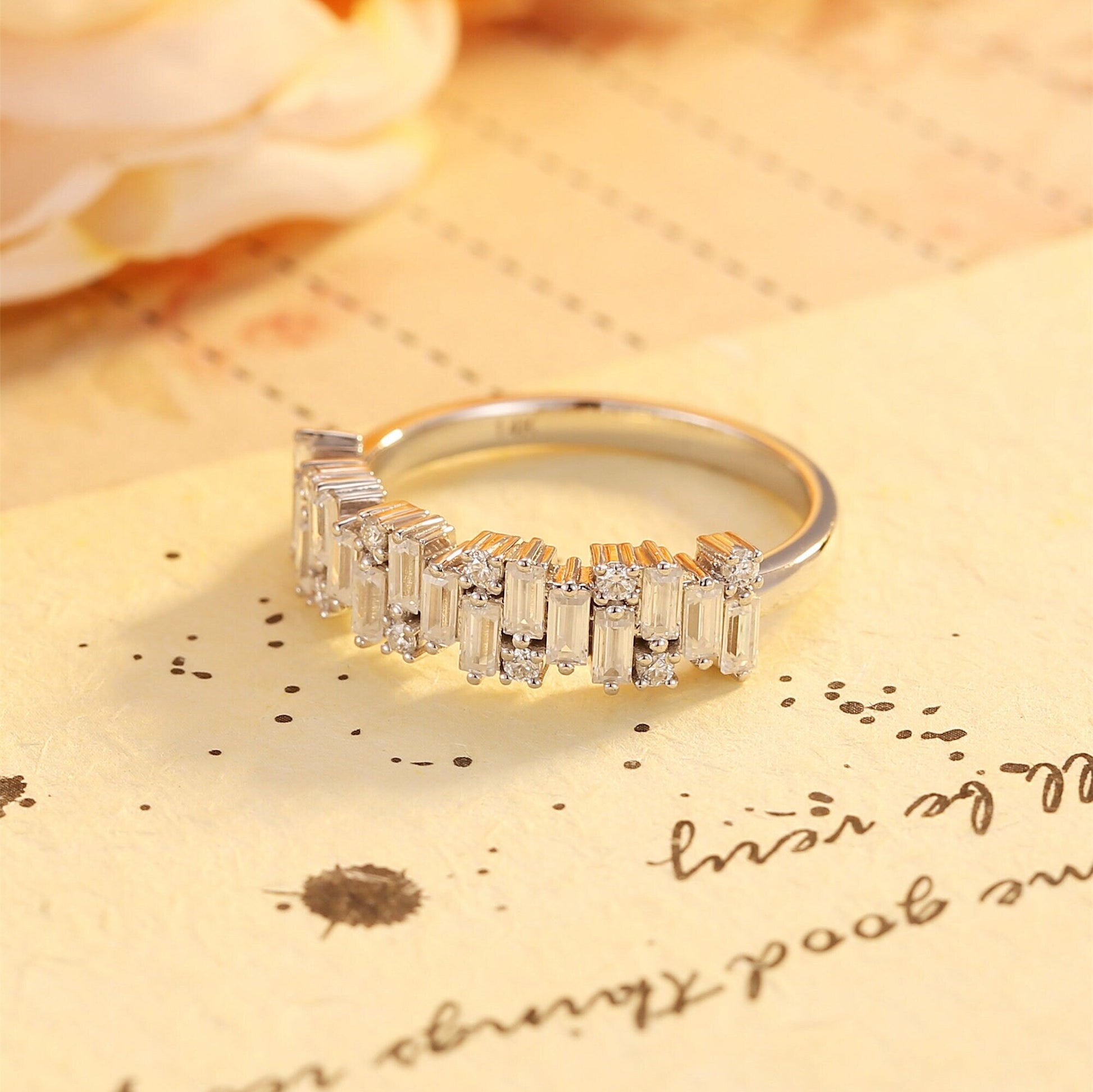 9K/14K/18K Solid Gold Staggered Baguette Ring, Round Cut Moissanite Paved Wedding Band, Half-Eternity Stacking Engagement Bridal Band