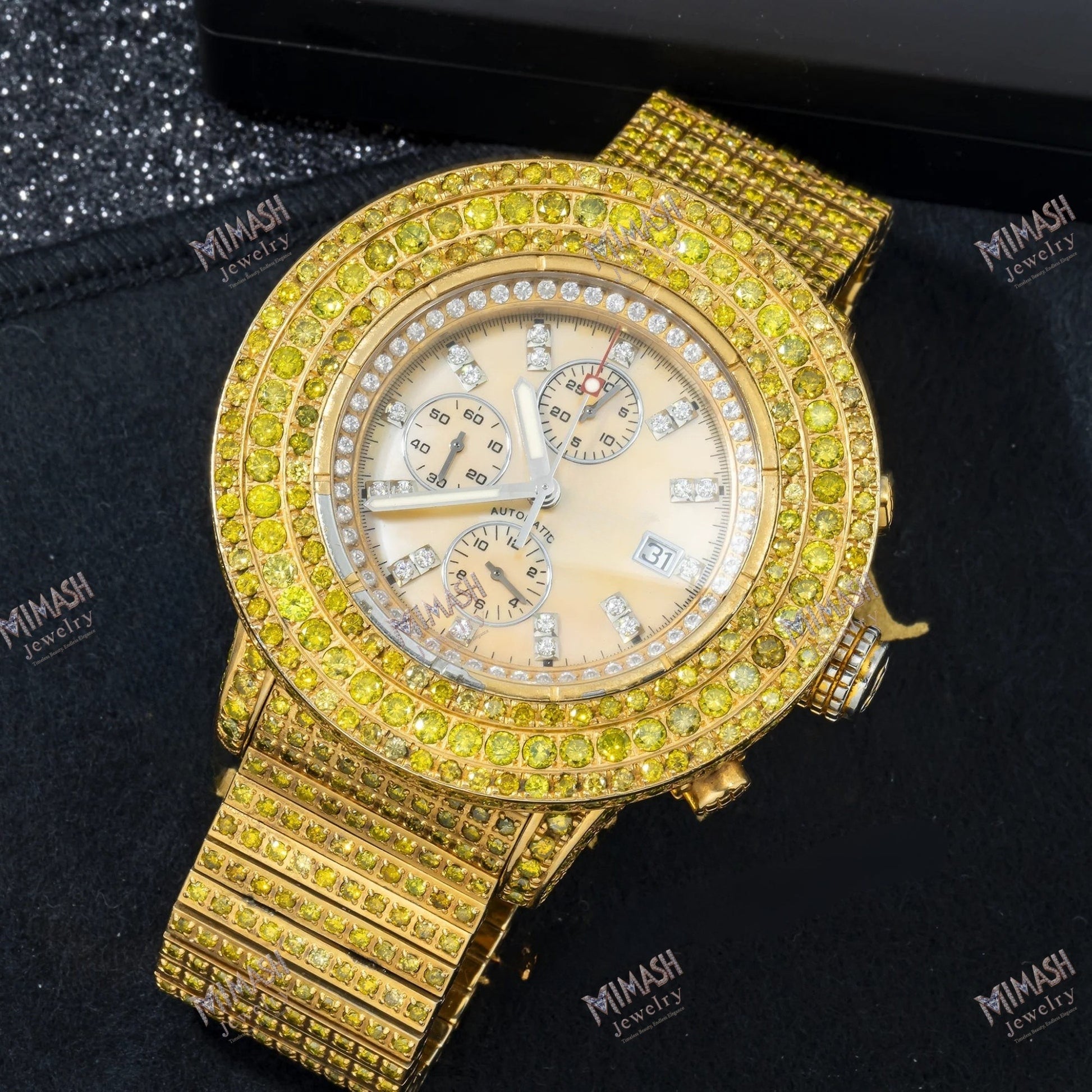 Real Sparkle Moissanite Watch 48MM Yellow Gold Champagne Diamond Dial