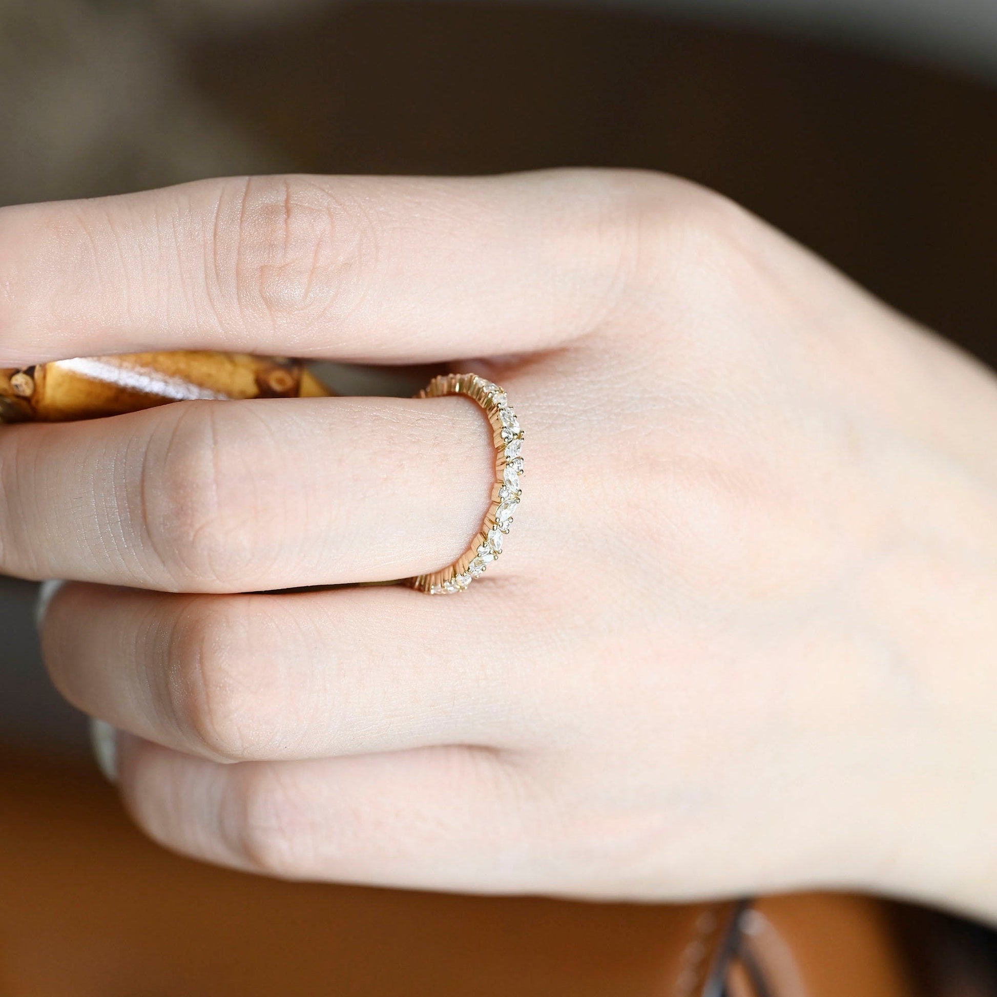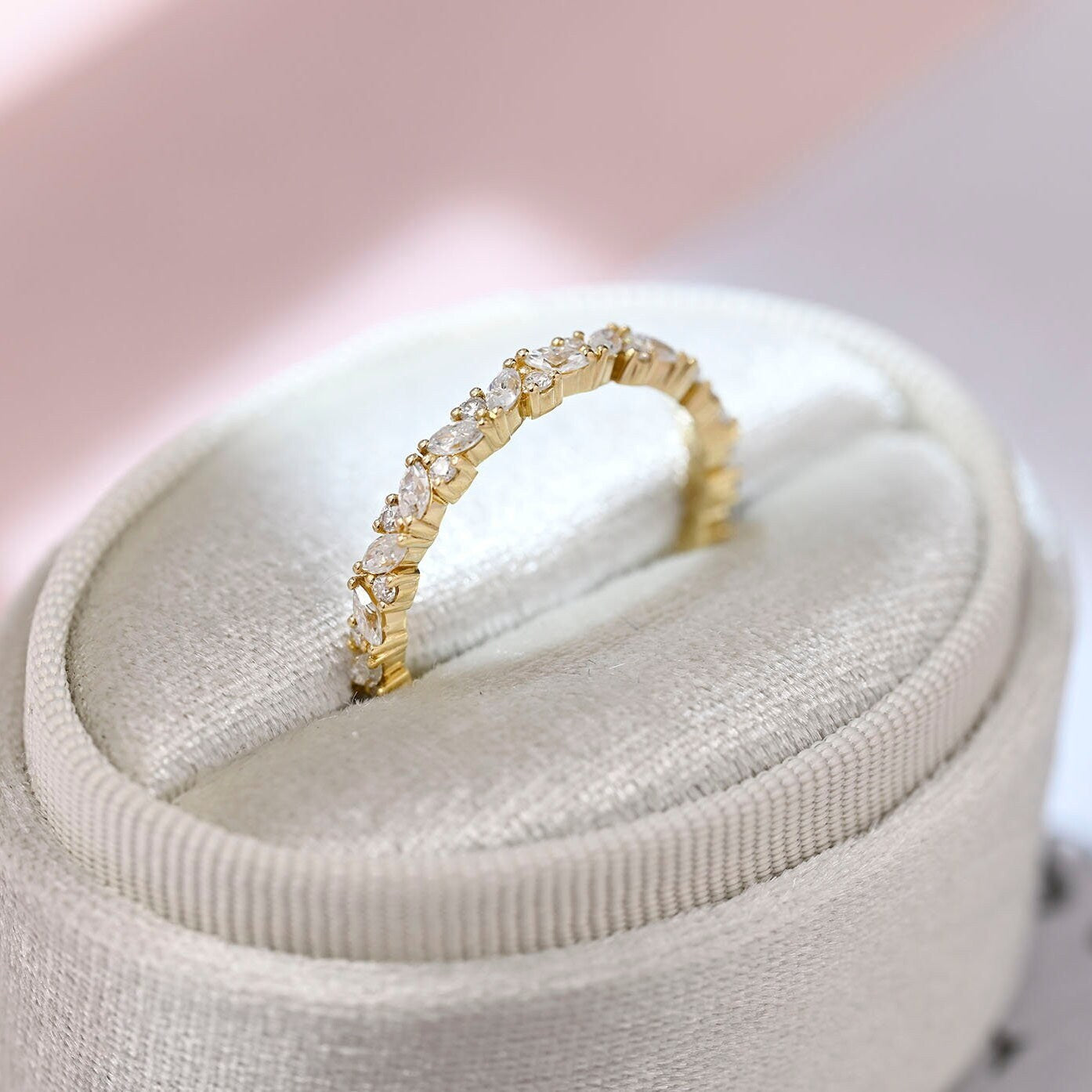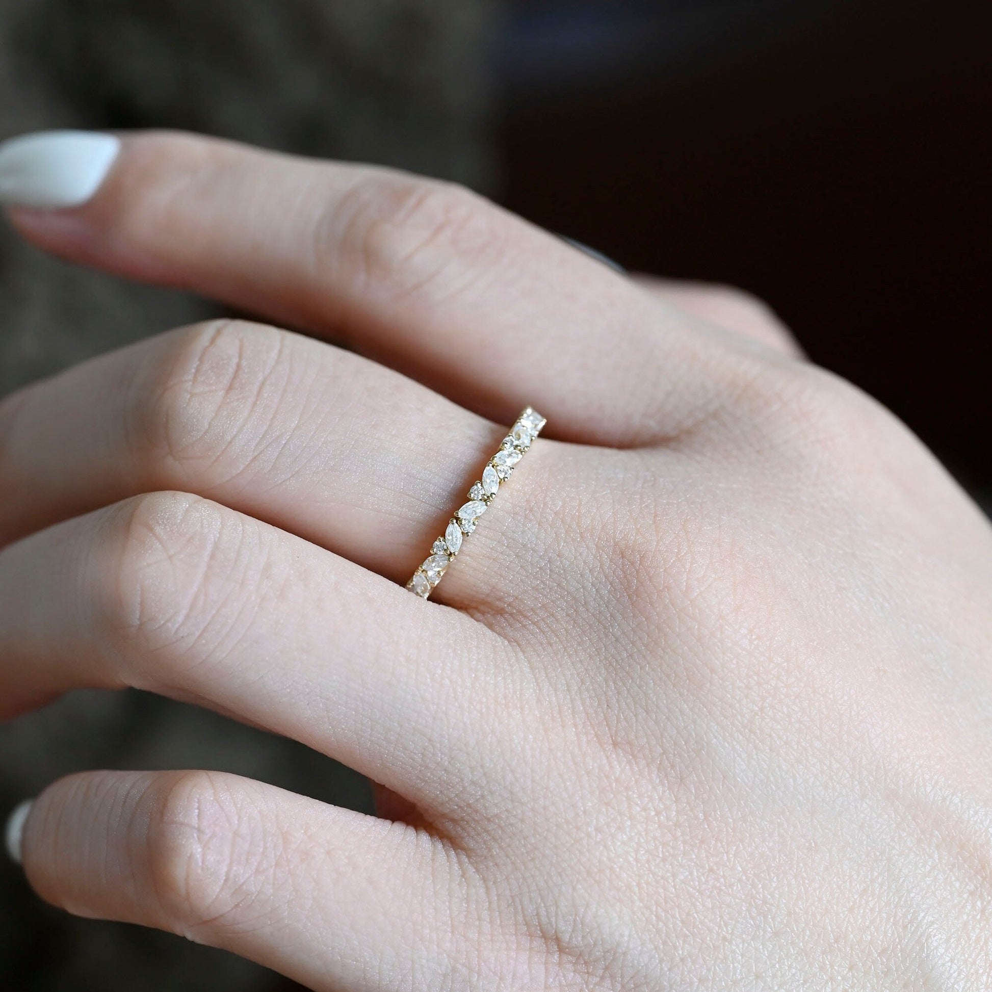 Marquise & Round Moissanite Wedding Ring, Solid Gold Full Eternity Wedding Band, Round Stacking Wedding Ring, Anniversary Gift for Women
