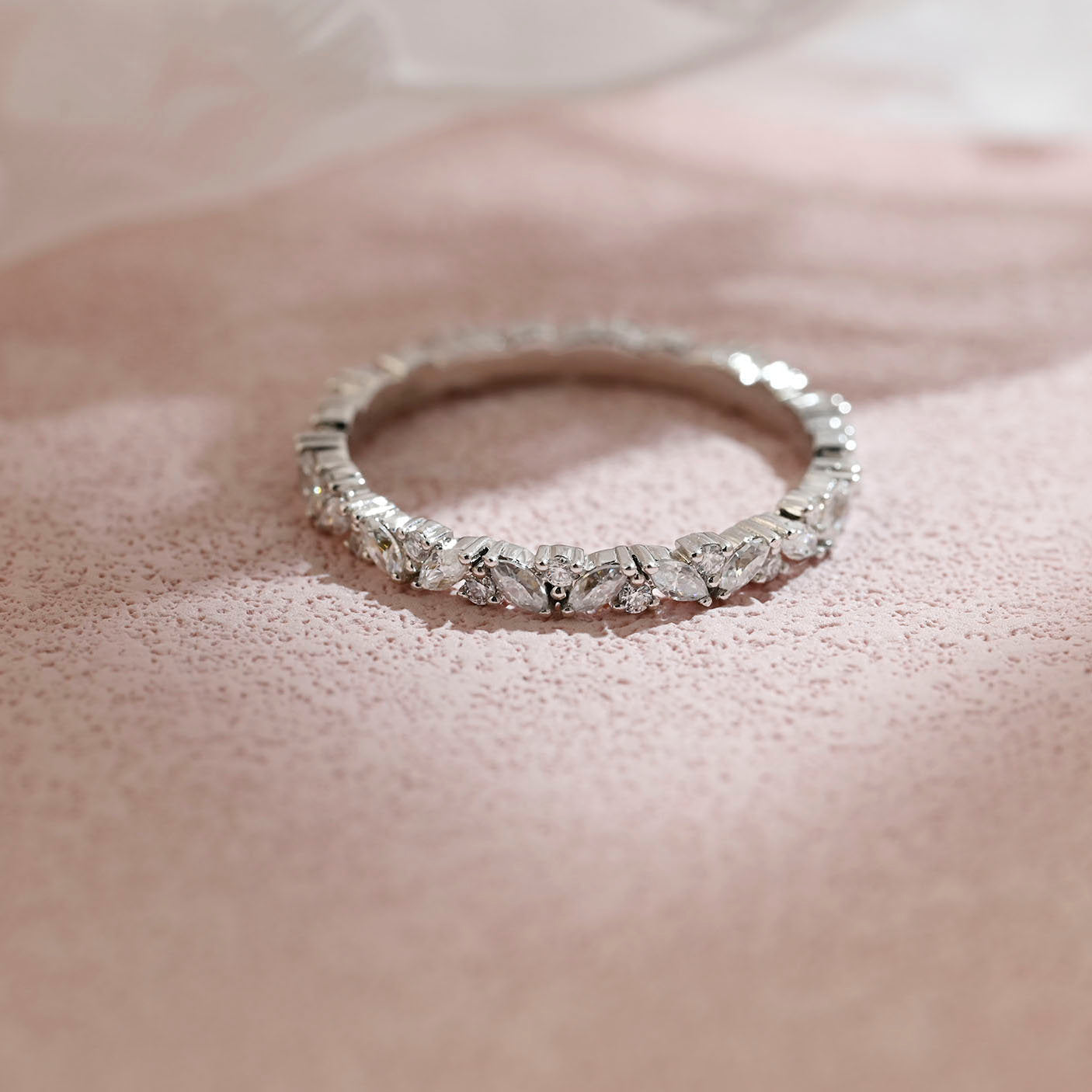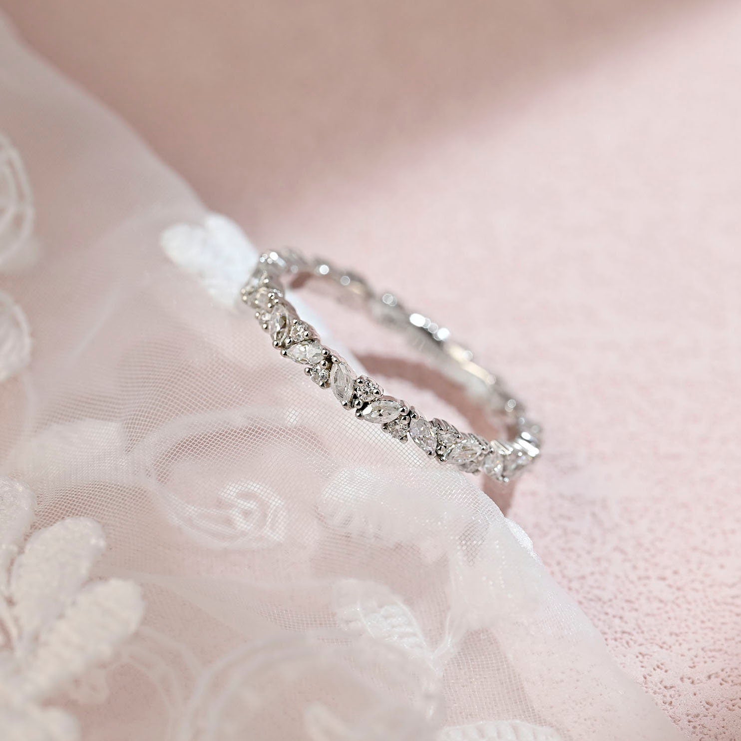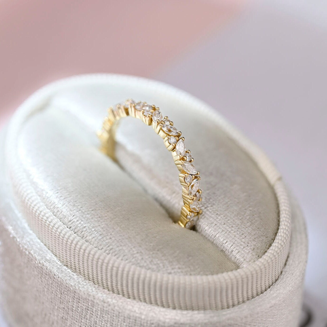 Marquise & Round Moissanite Wedding Ring, Solid Gold Full Eternity Wedding Band, Round Stacking Wedding Ring, Anniversary Gift for Women