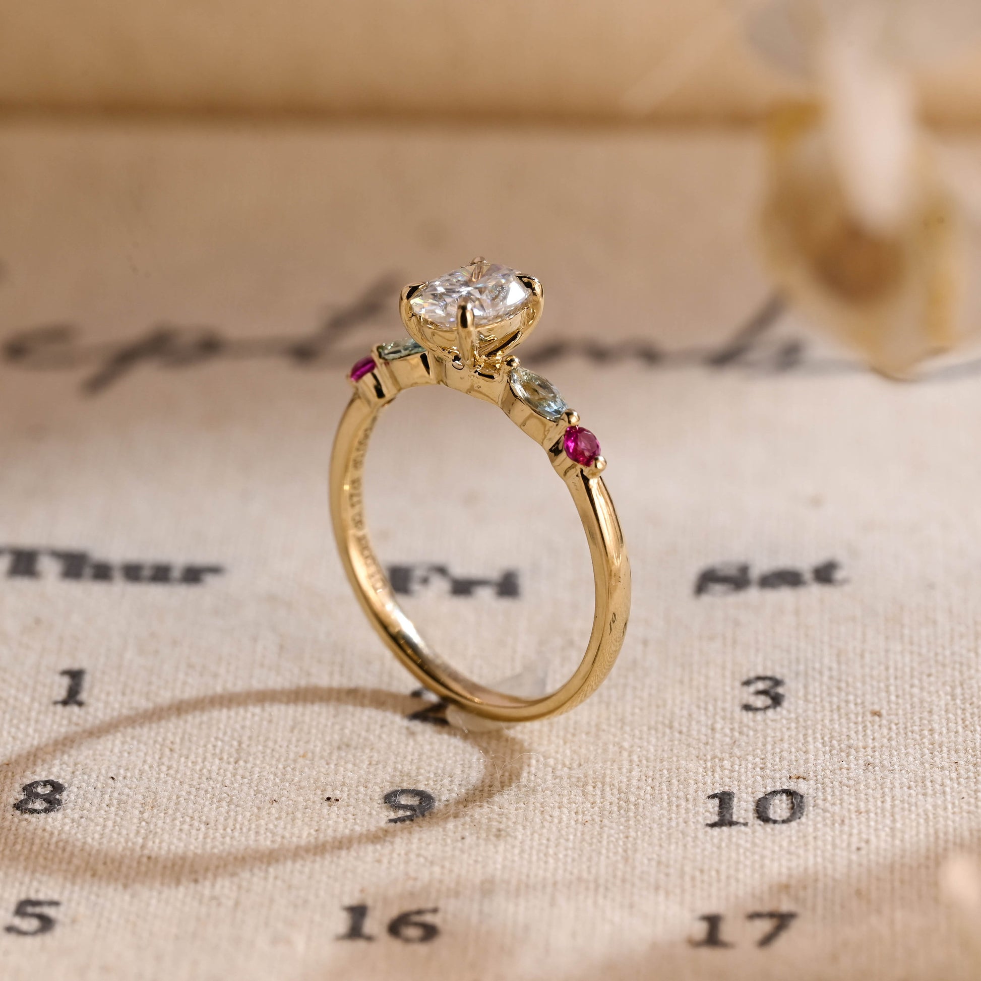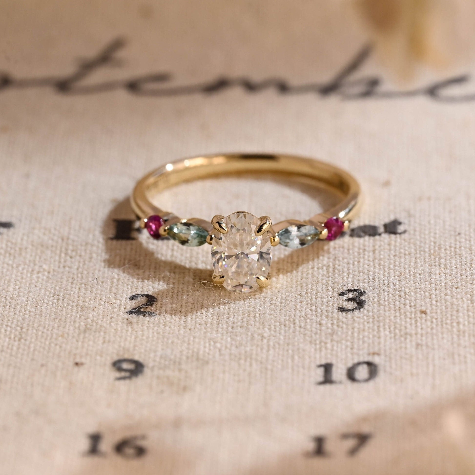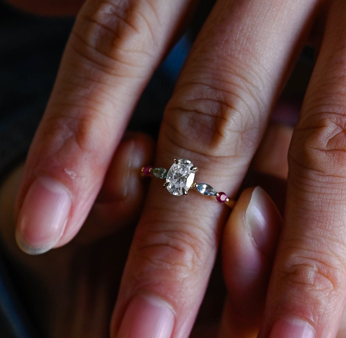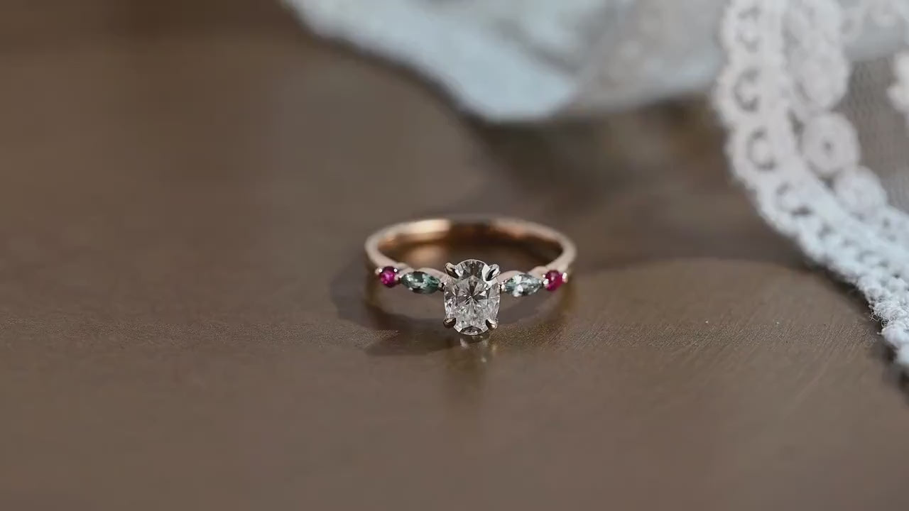 1.00ct Oval Diamond Engagement Ring With Marquise Sapphire & Ruby Side Stone Ring, Promise Ring, Bridal Ring