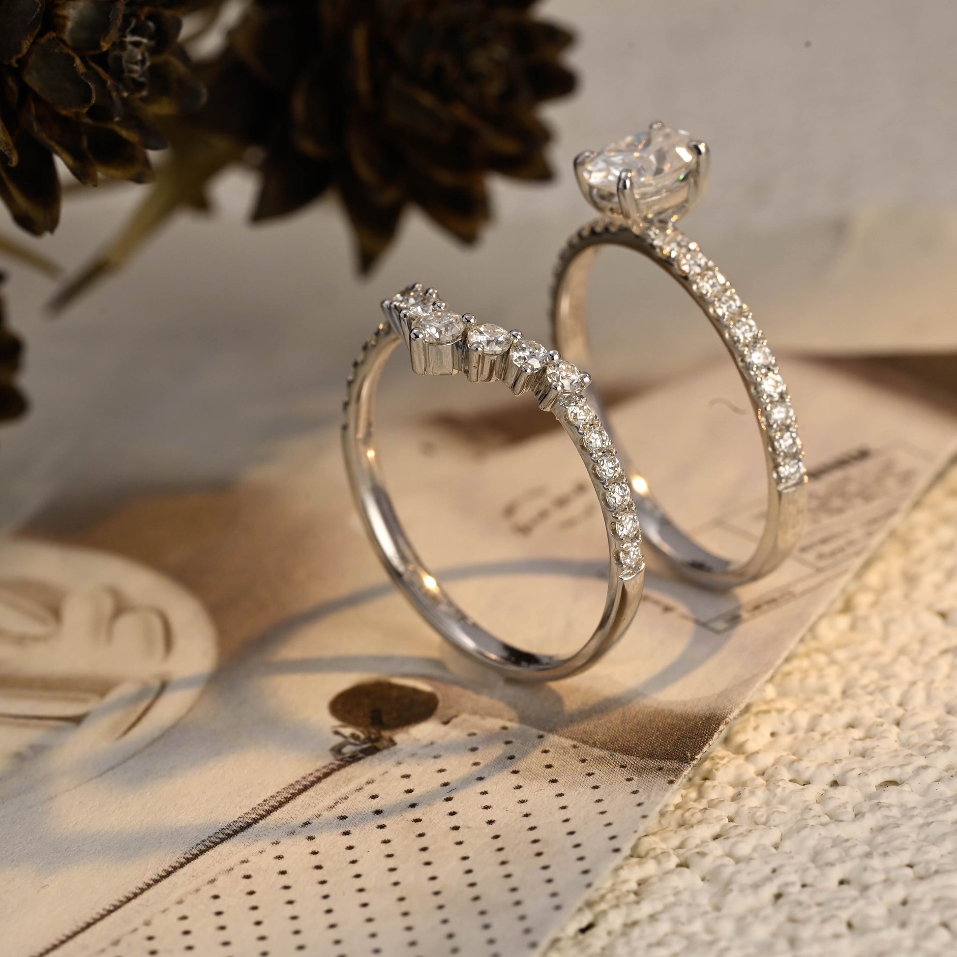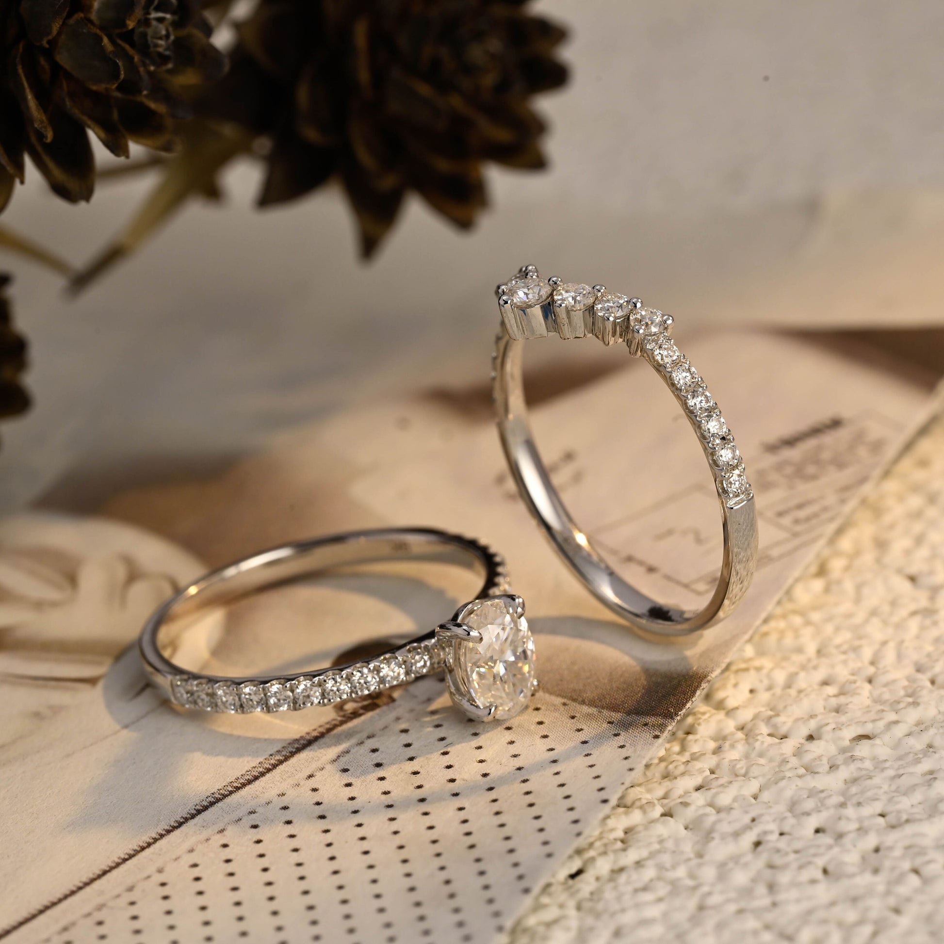 Our jewelry is crafted with simulant diamonds, moissanite, natural diamonds, lab-grown diamonds, and fine metals like 925 silver (with gold plating) and solid 10K, 14K, and 18K gold in white, yellow, and rose gold.