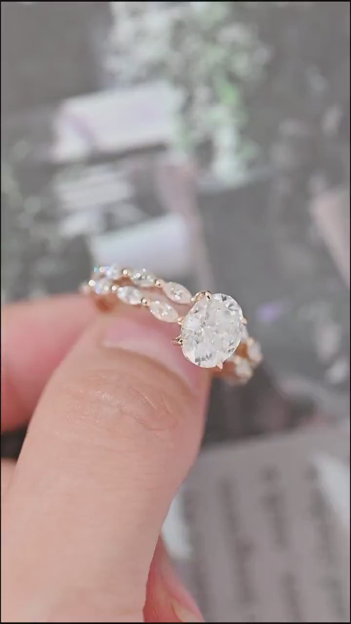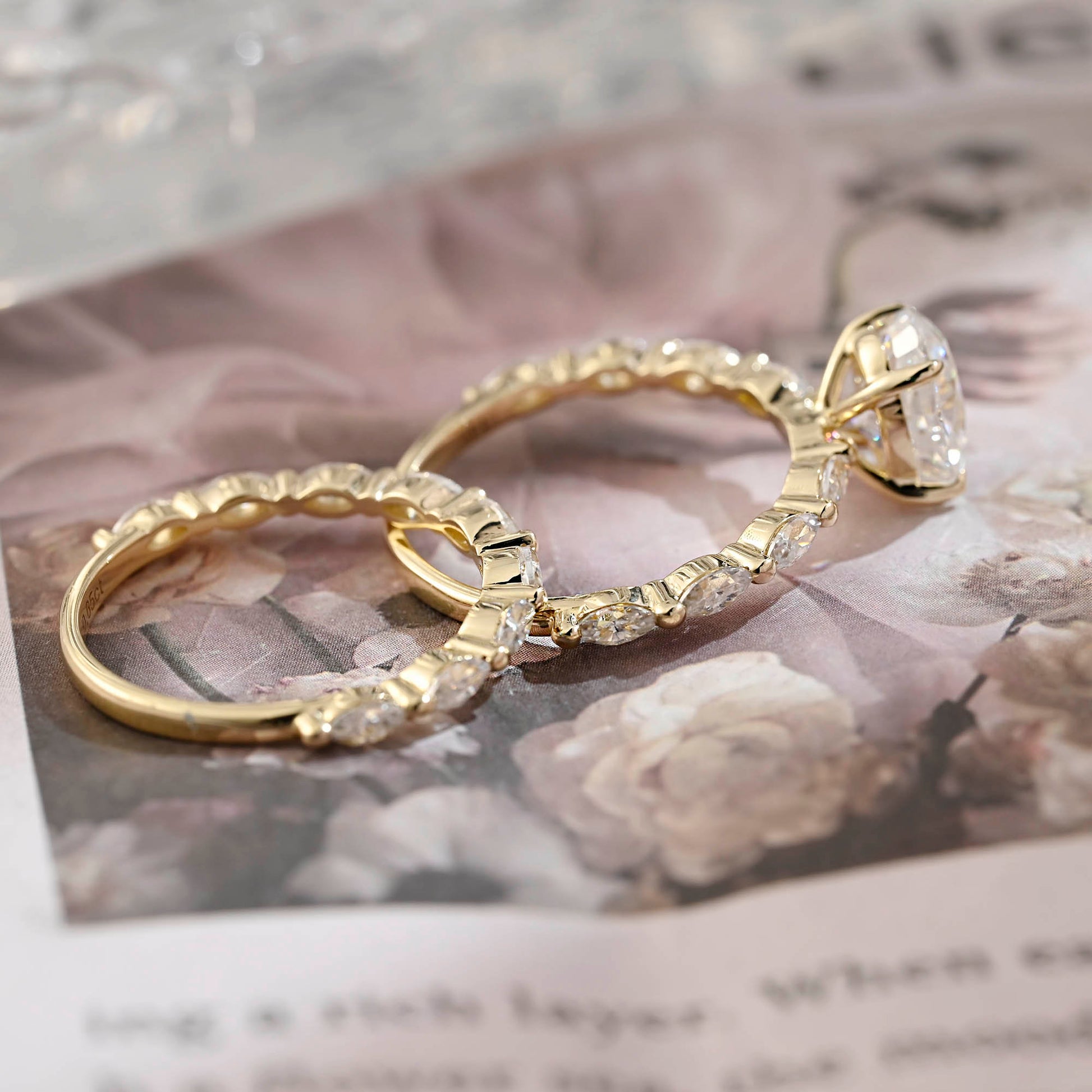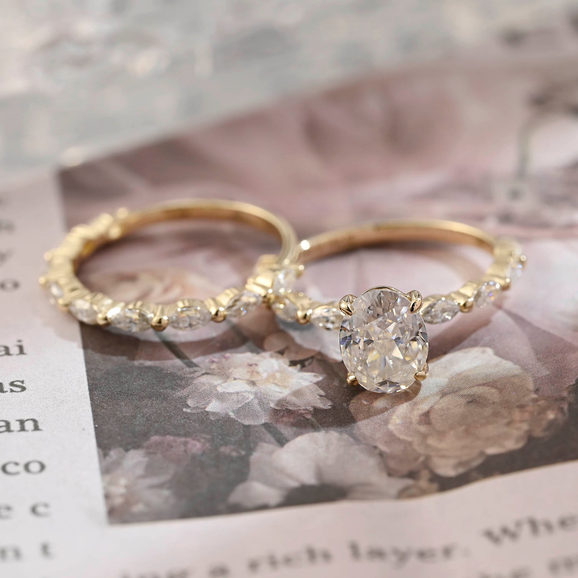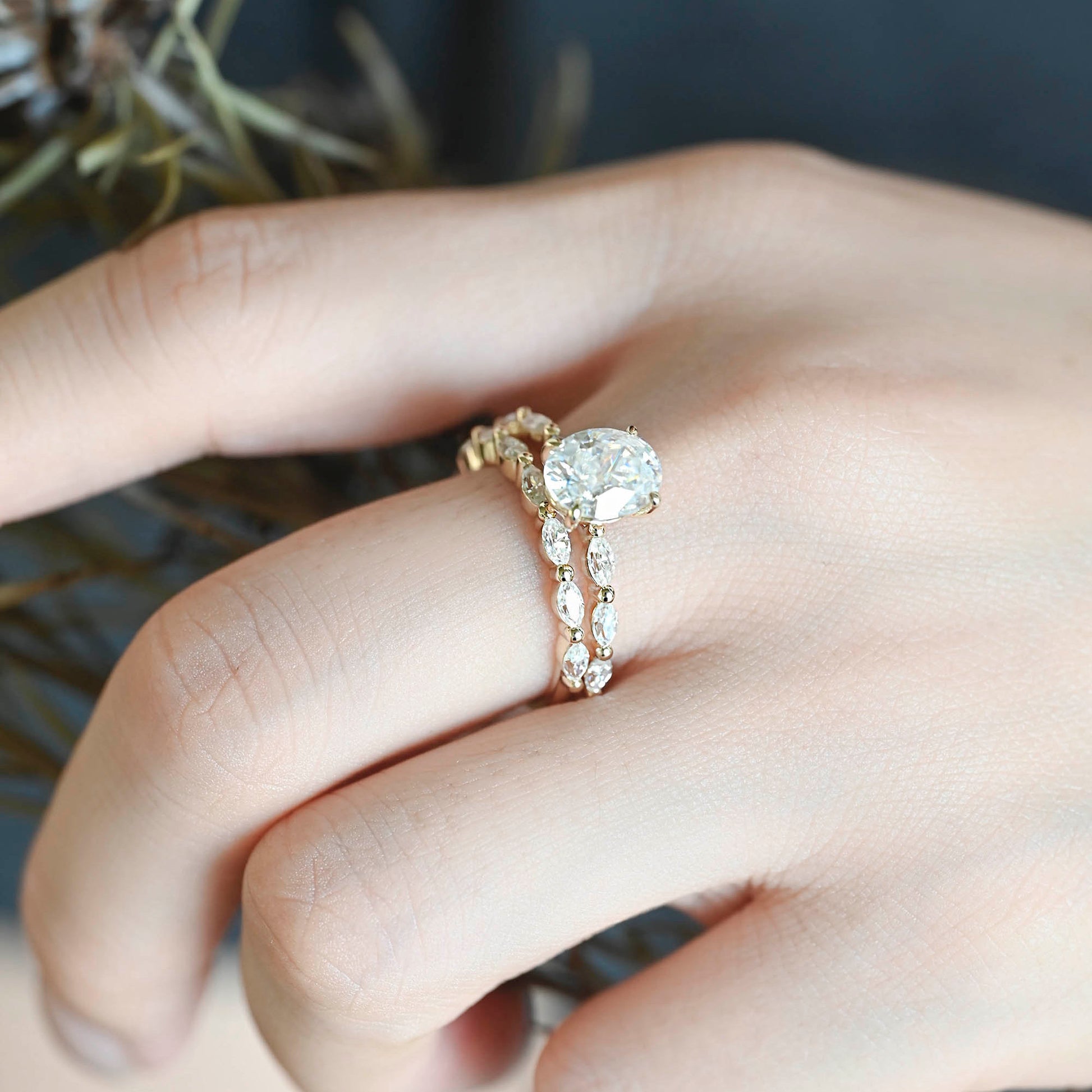 Oval/Marquise Cut Moissanite Engagement Ring Set, 9K/14K/18K Solid Gold Customizable Promise Handmade Anniversary Bridal Ring Set for Women