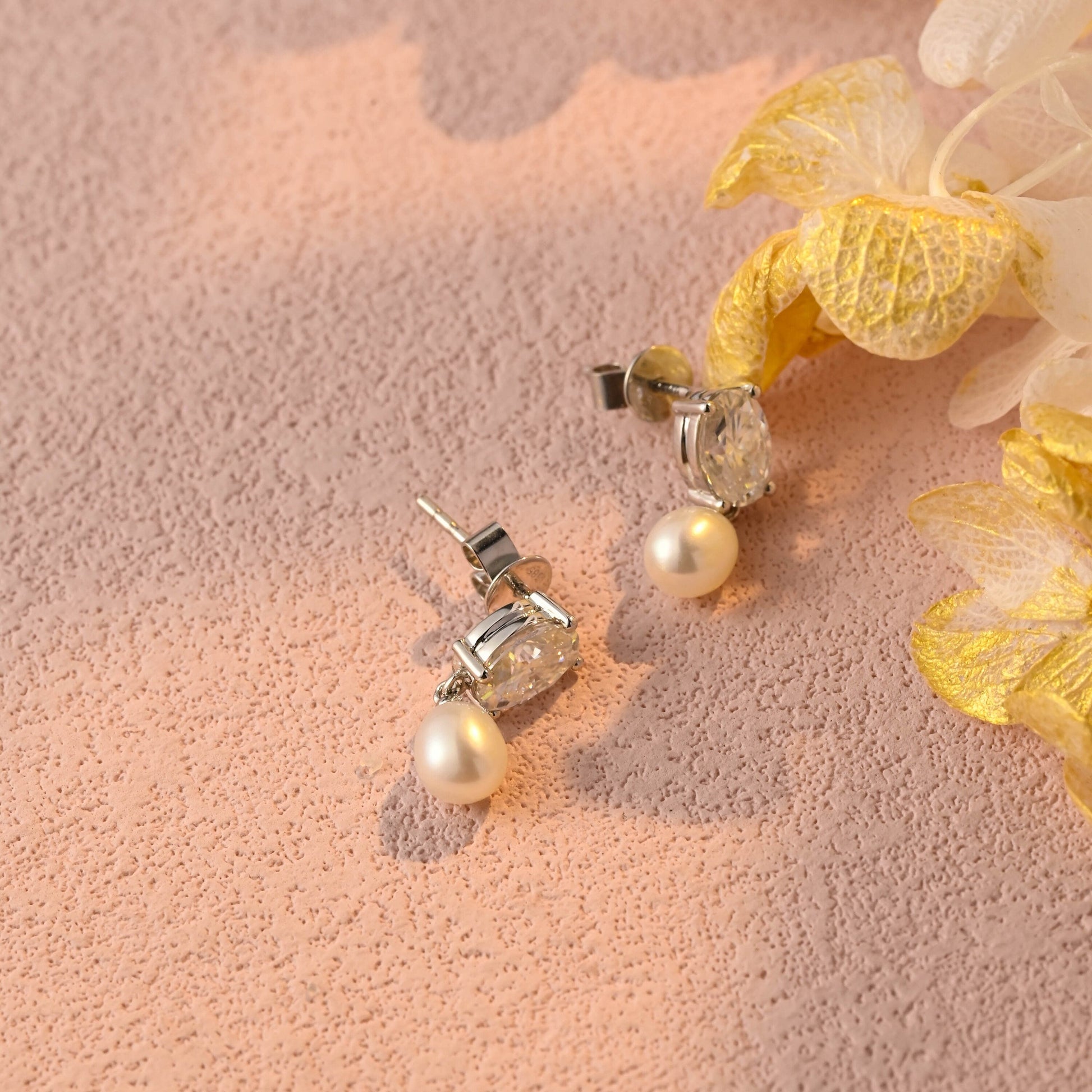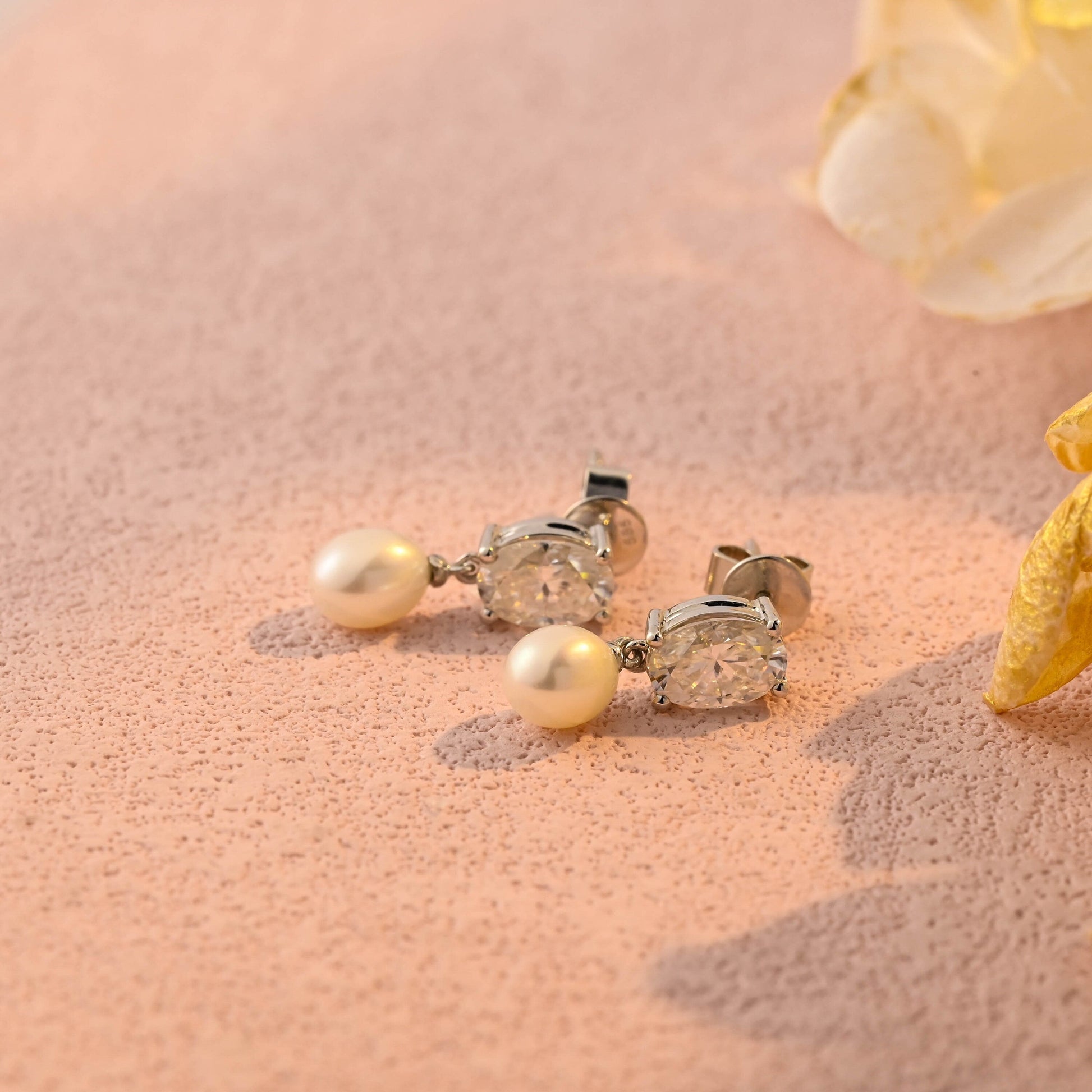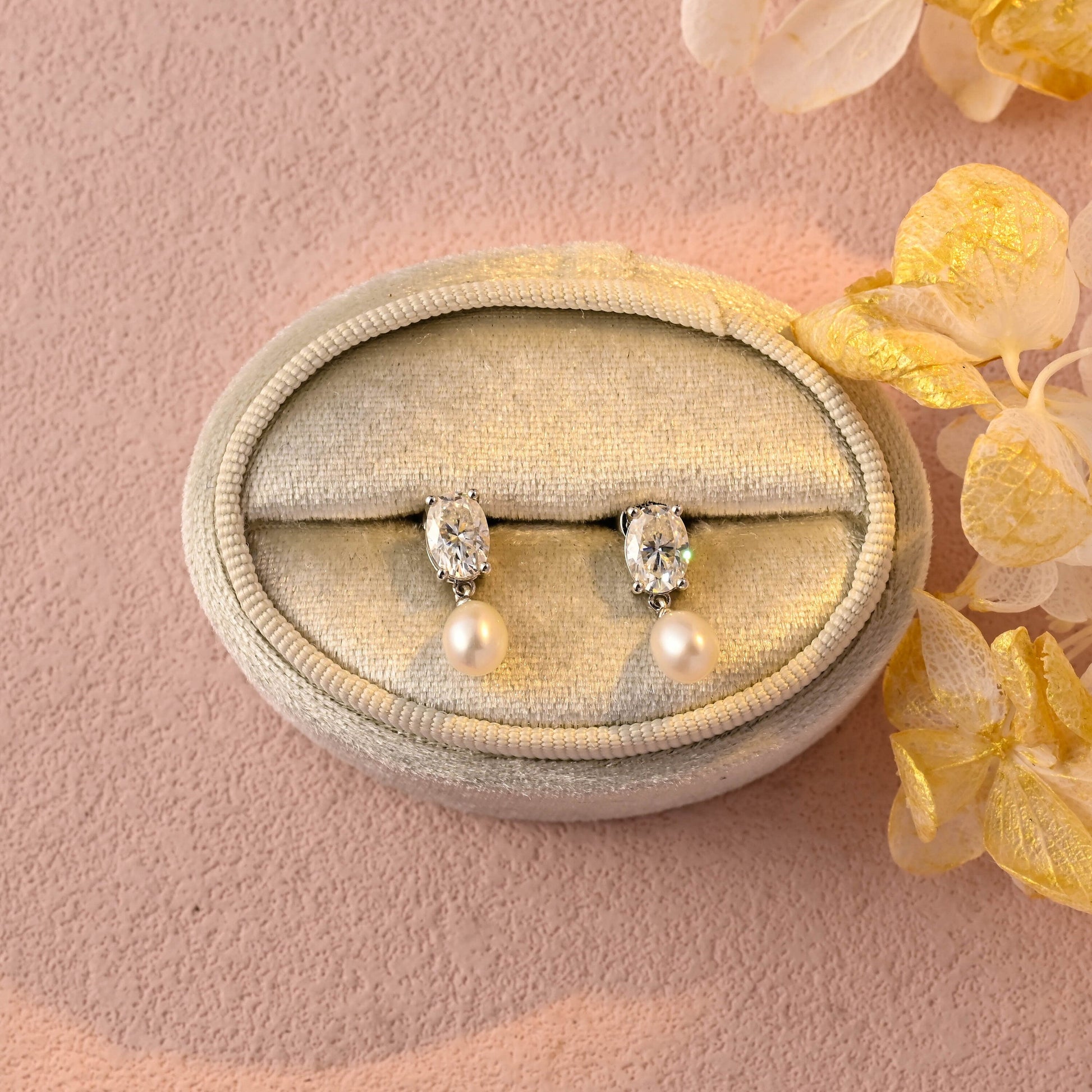 Oval Moissanite and Pearl Earring Stud/Oval Moissanite Earrings Gold/Pearl Drop Earrings/Teardrop Earrings Gold/Anniversary Gift for Woman