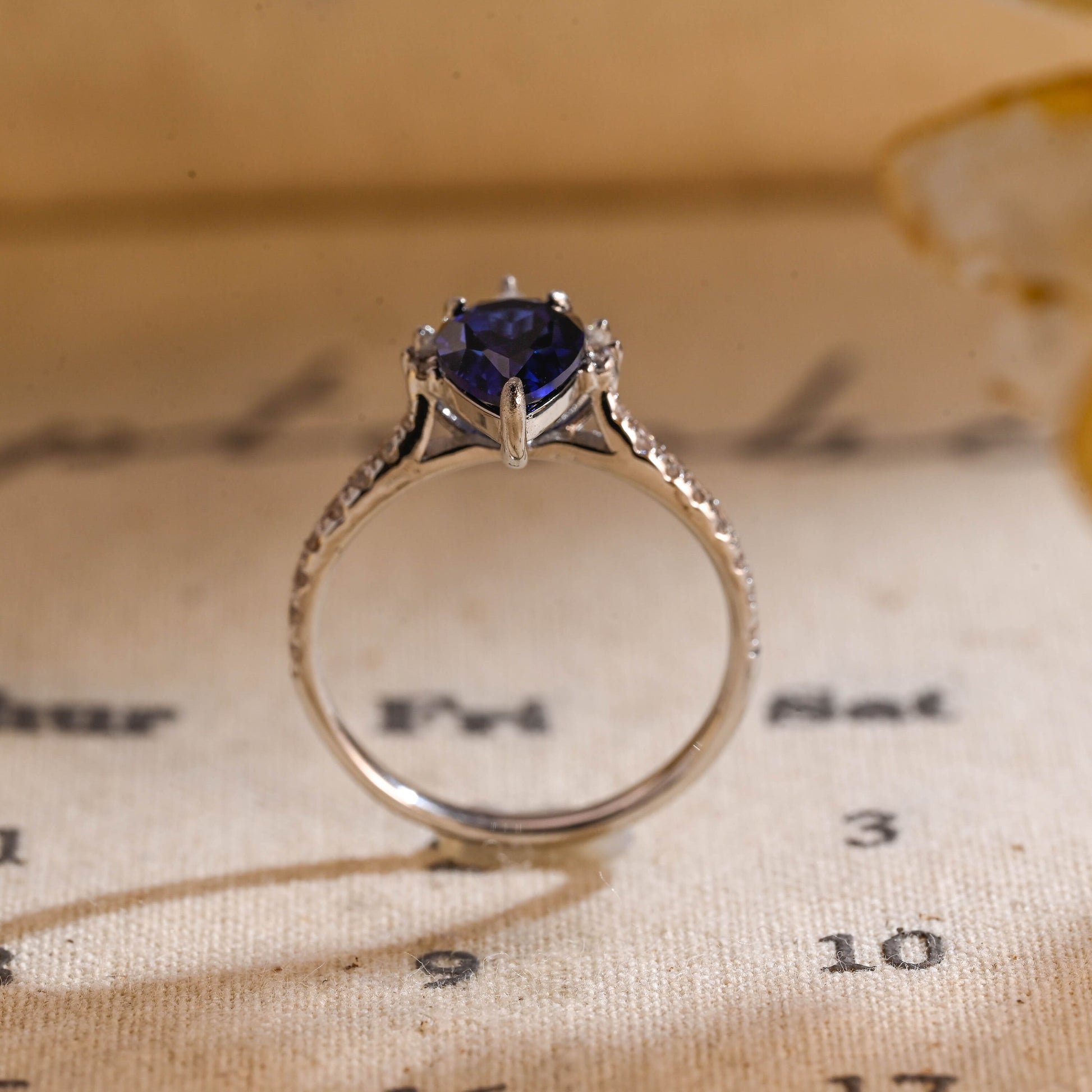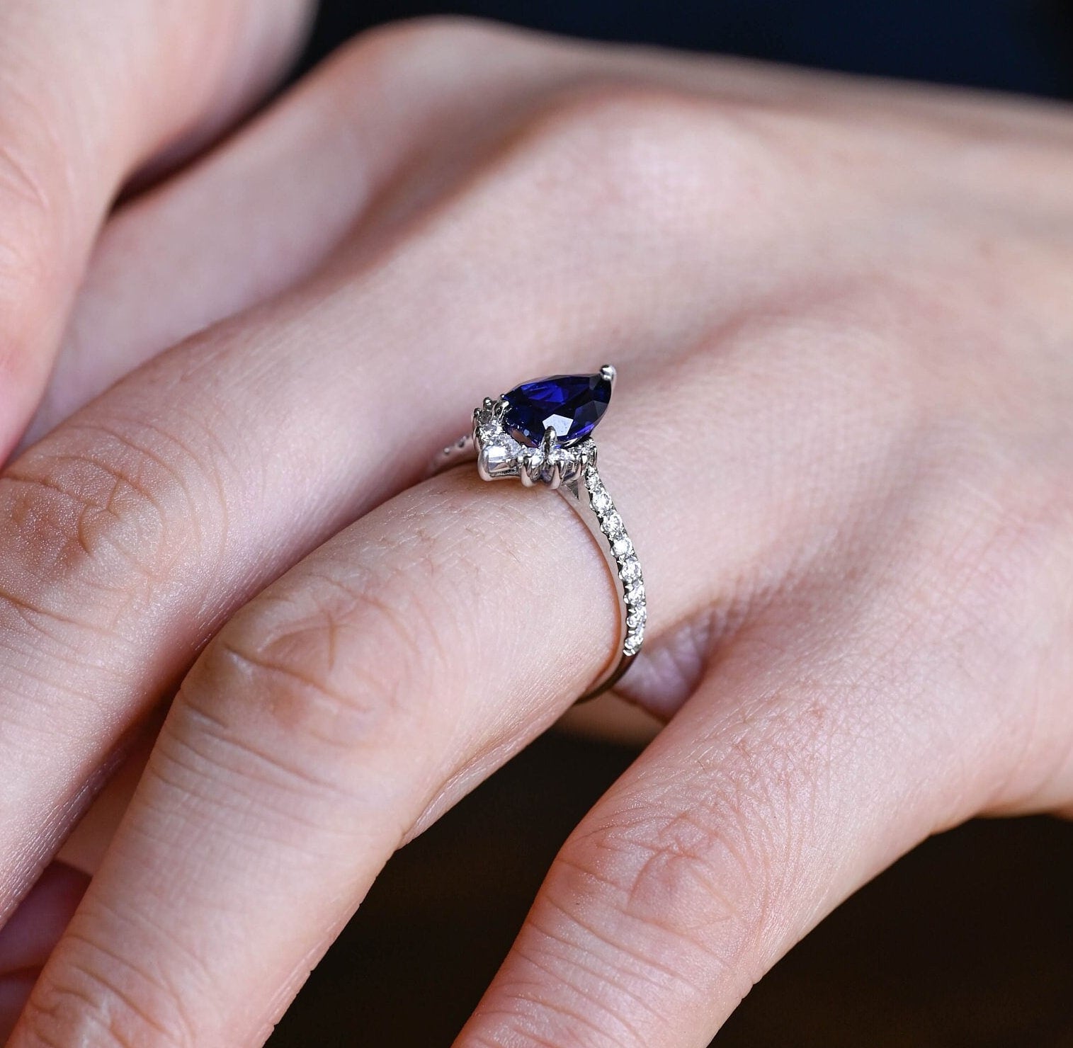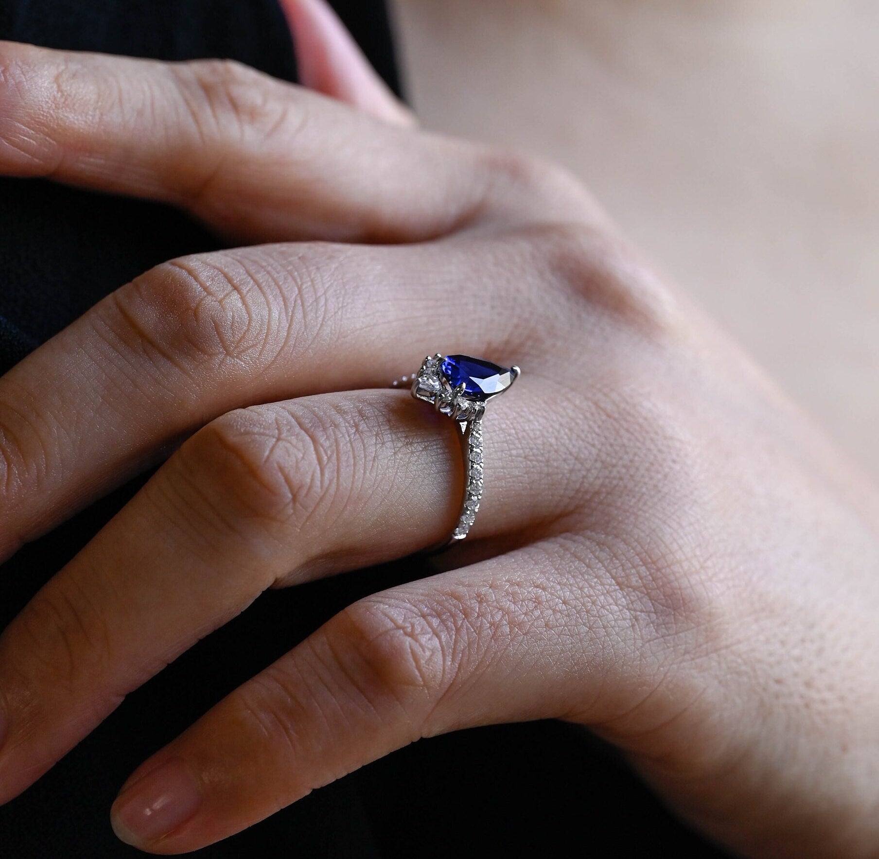 2.00ct Pear Shaped Blue Sapphire Engagement Ring, Pave Set Cathedral SettingΒ Vintage Style Pear Wedding Ring, Carrot Ring Anniversary Gifts for Her