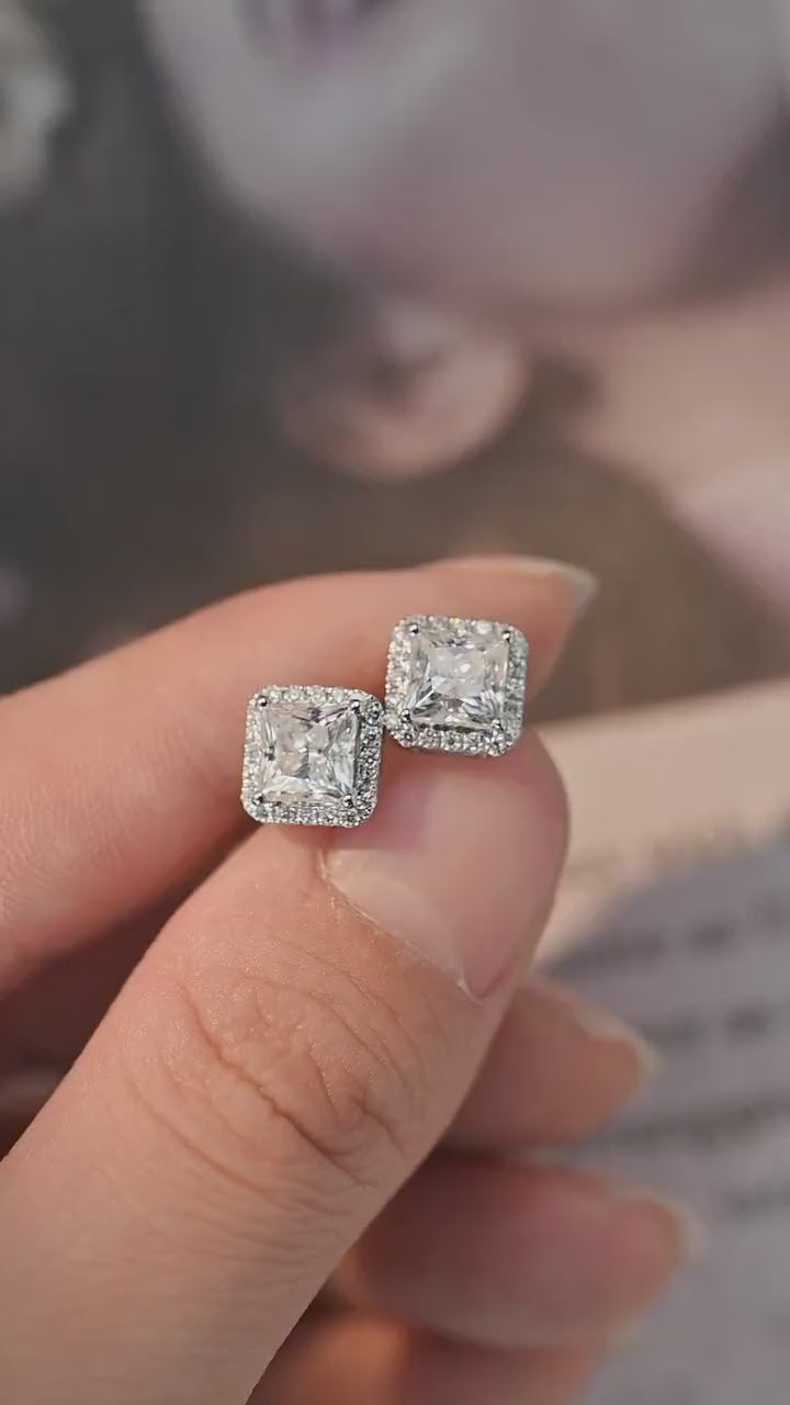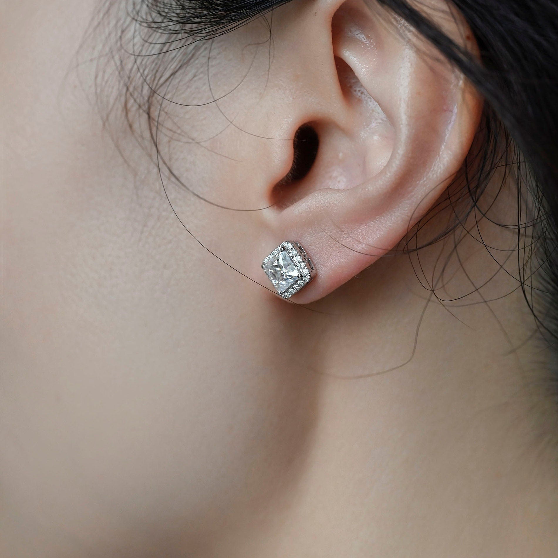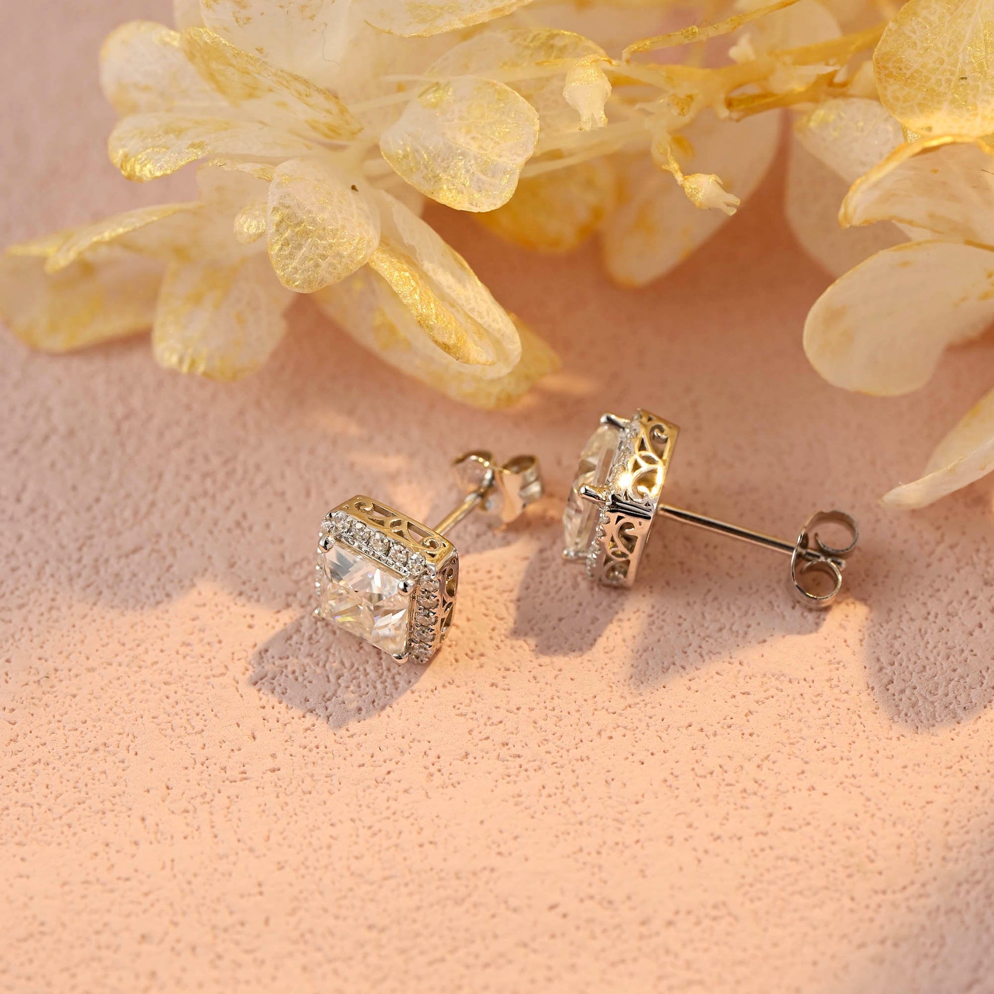 Princess Cut Moissanite Earring Studs Halo/Halo Wedding Earring Stud/Bridal Earring Studs Gold/Anniversary Gift Birthday Gift for Woman