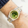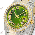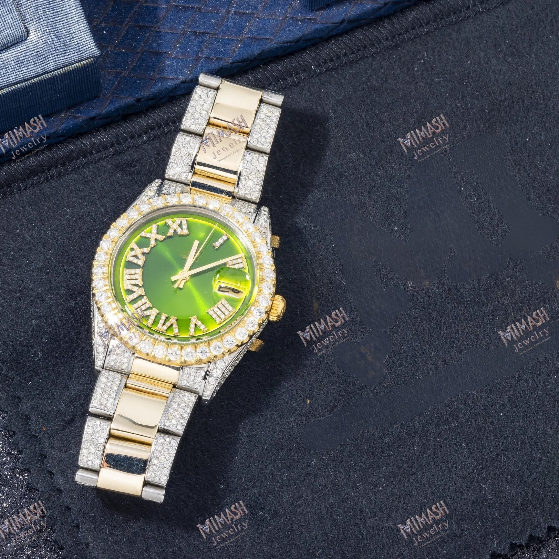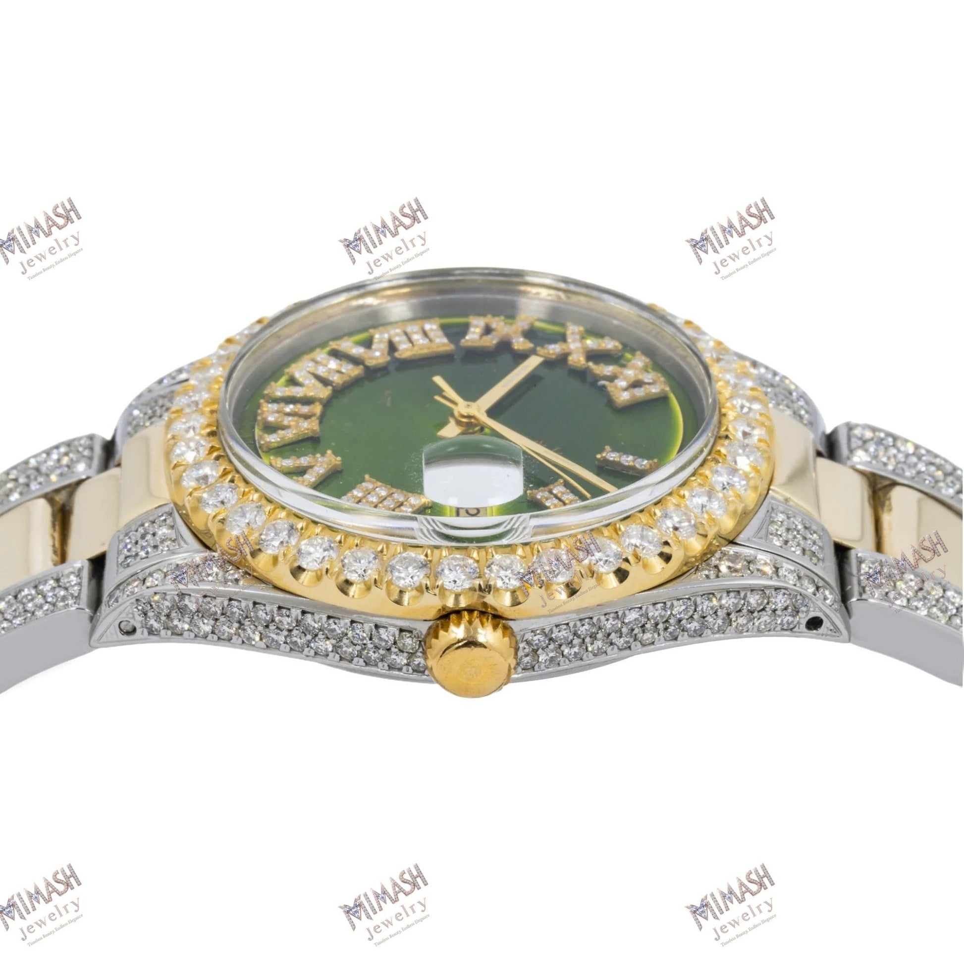 Auric Chrono Moissanite Diamond Watch 36MM Green Diamond Roman Diamond Dial, Bezel, And Two Tone Oyster Bracelet