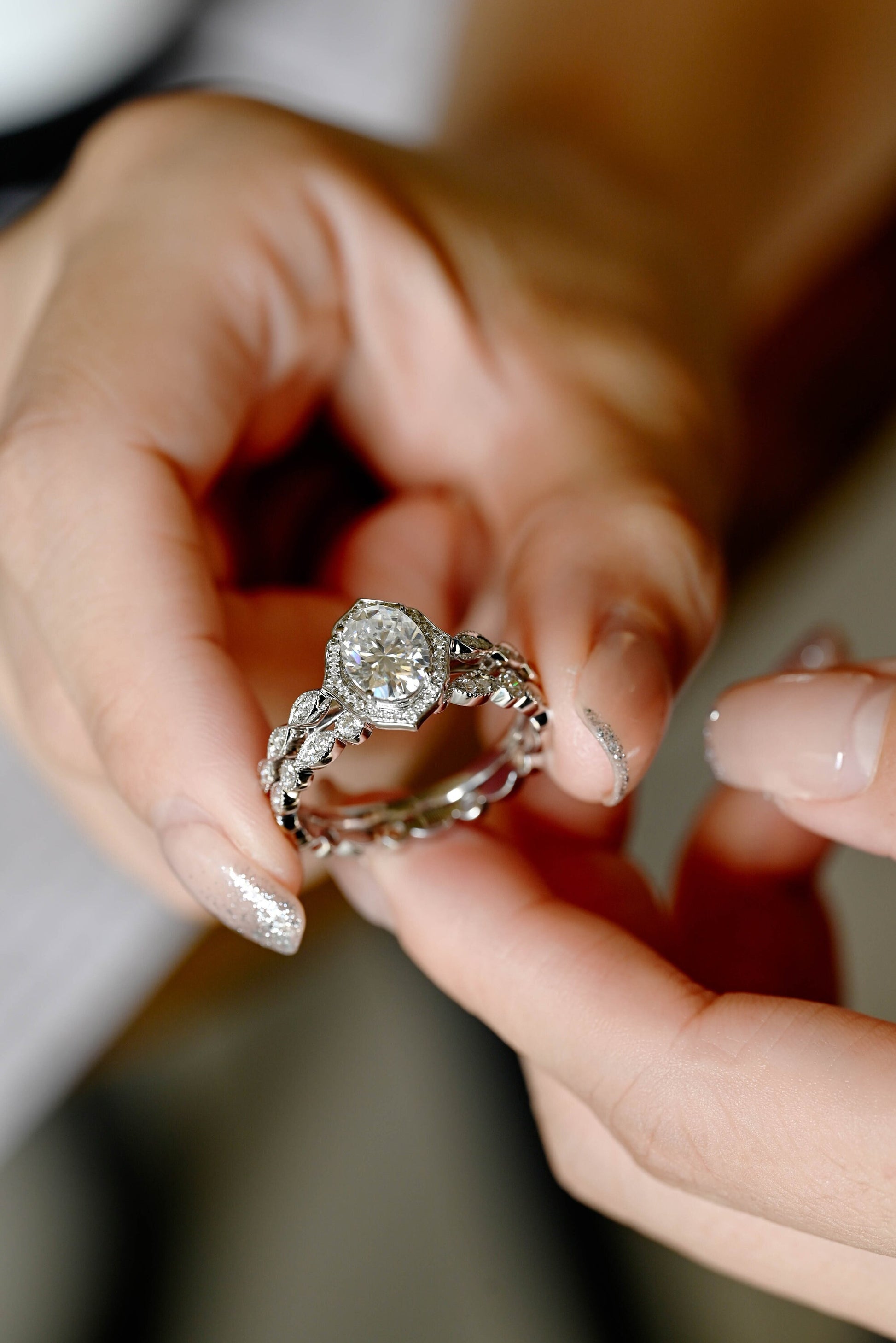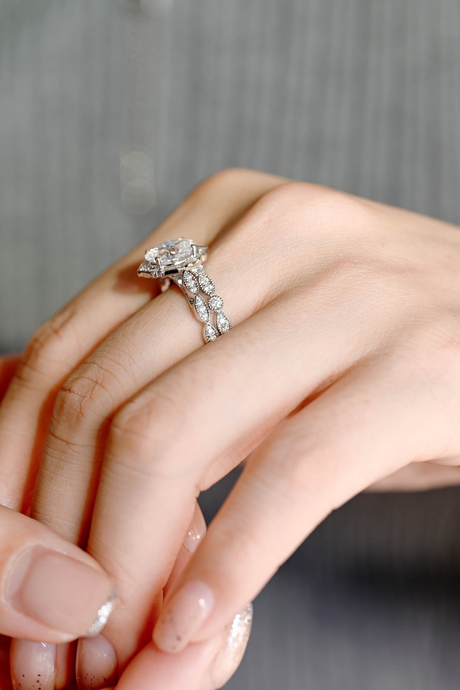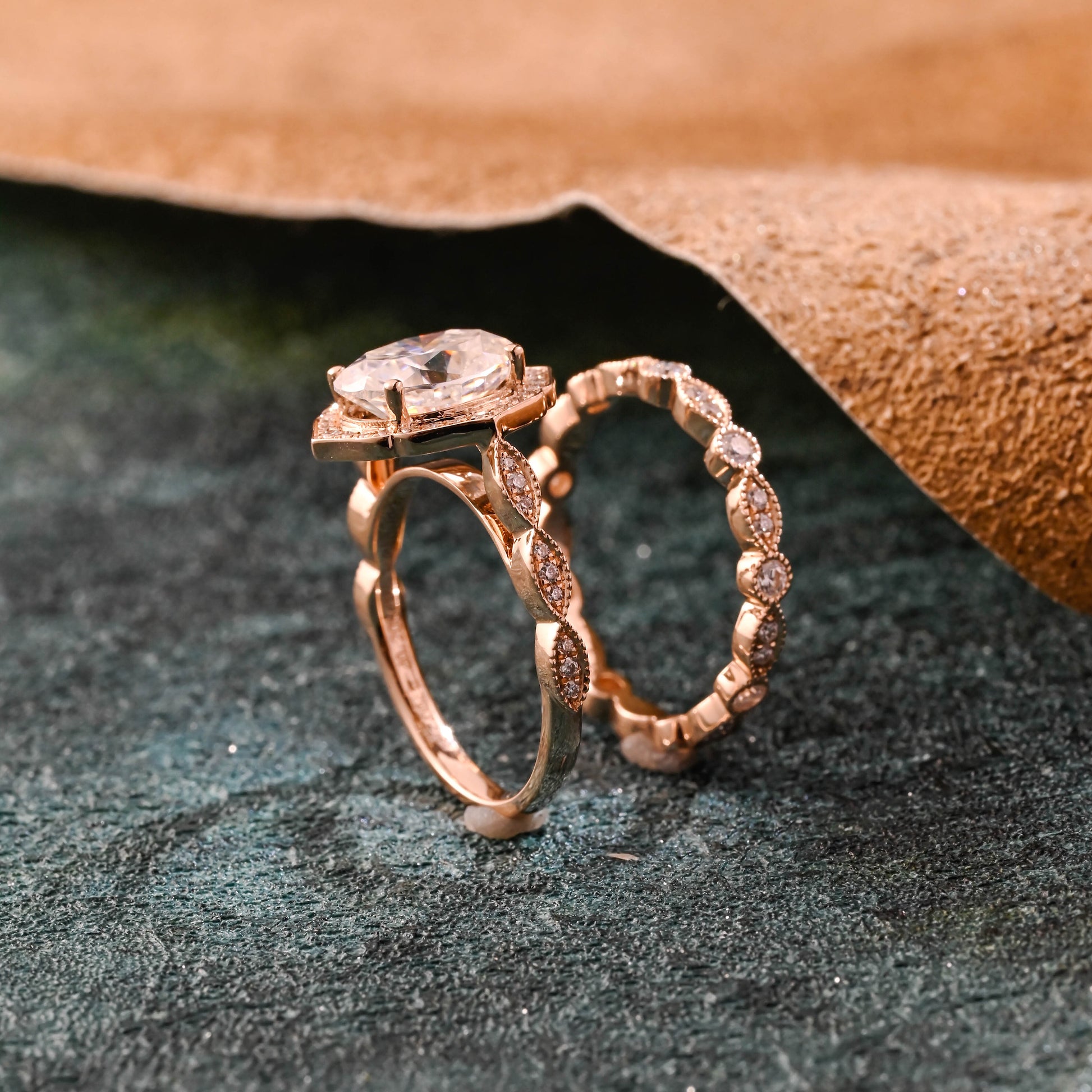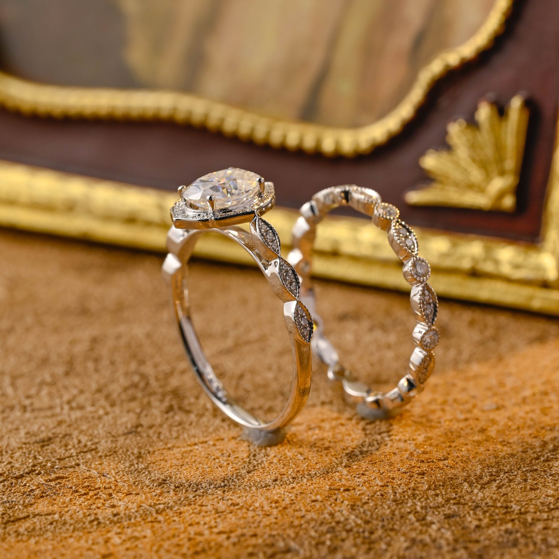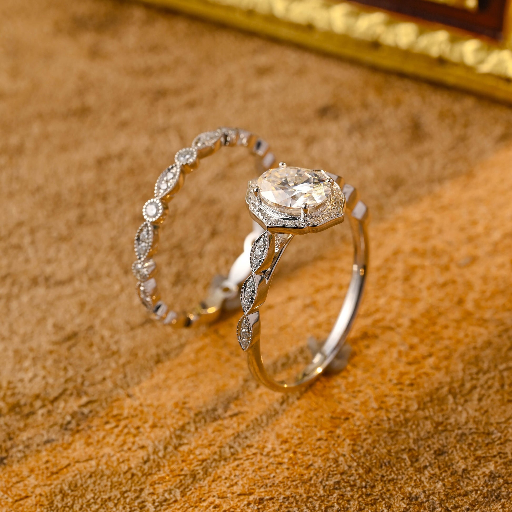 Solid Gold Oval Cut Moissanite Engagement Ring and Wedding Band Set, Vintage Bridal Ring Set, Art Deco Ring, Anniversary Gift for Woman,Wife
