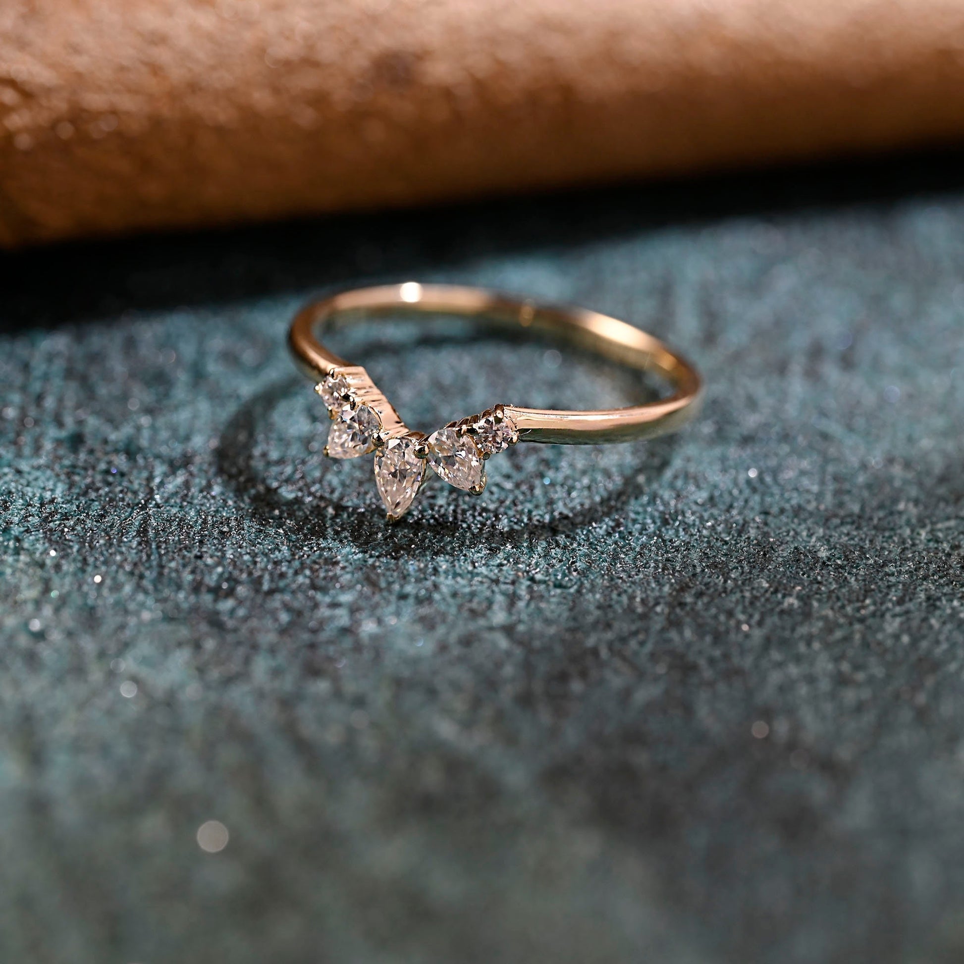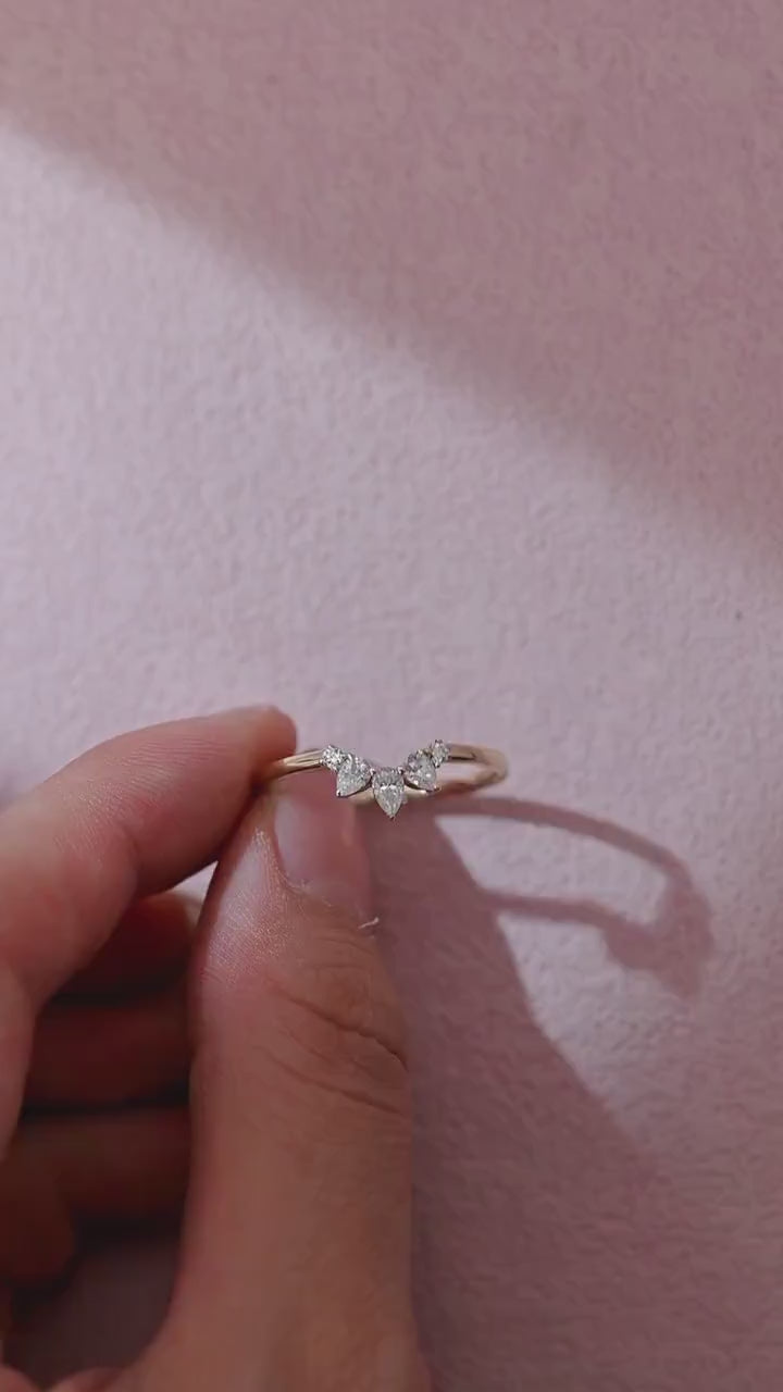 Solid Gold Pear & Round Cut Moissanite Wedding Band, Curved Wedding Ring, Stacking Ring, Anniversary / Birthday Gift for Woman, Wife, Girl