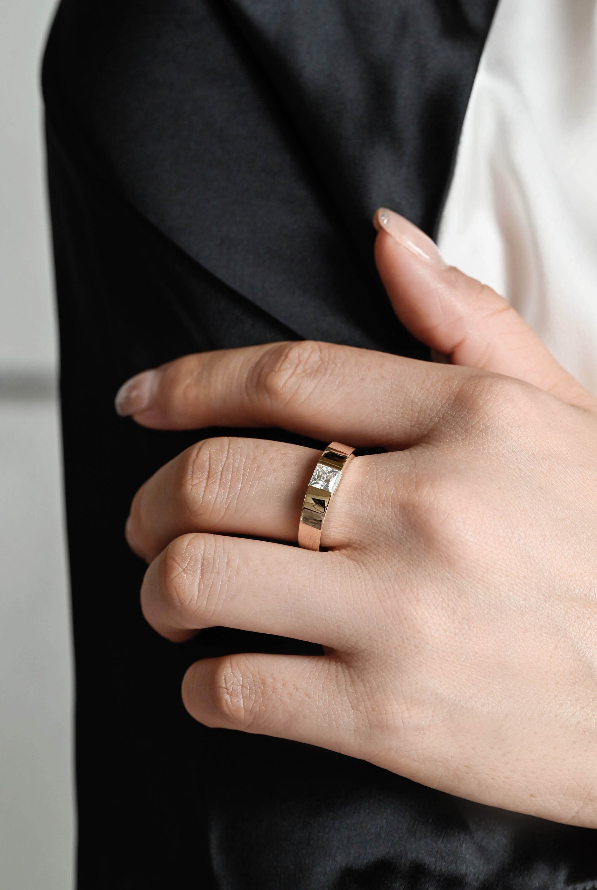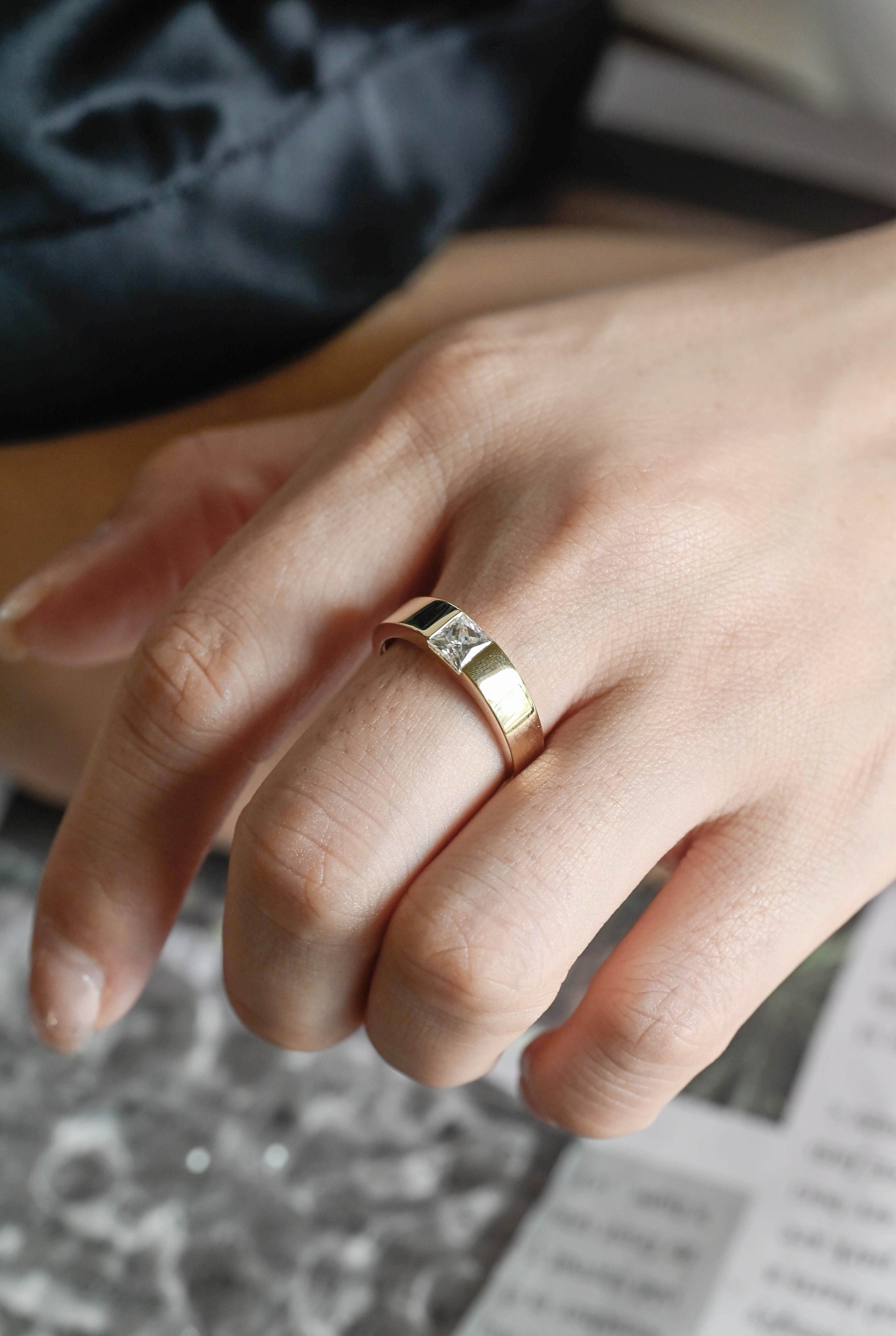 Solid Gold Princess Cut Moissanite Wedding Ring, Minimalist Wedding Band, Art Deco Ring, Anniversary / Birthday Gift for Men, Husband, Him