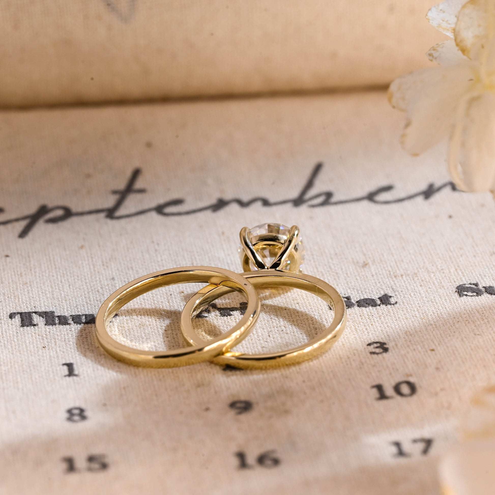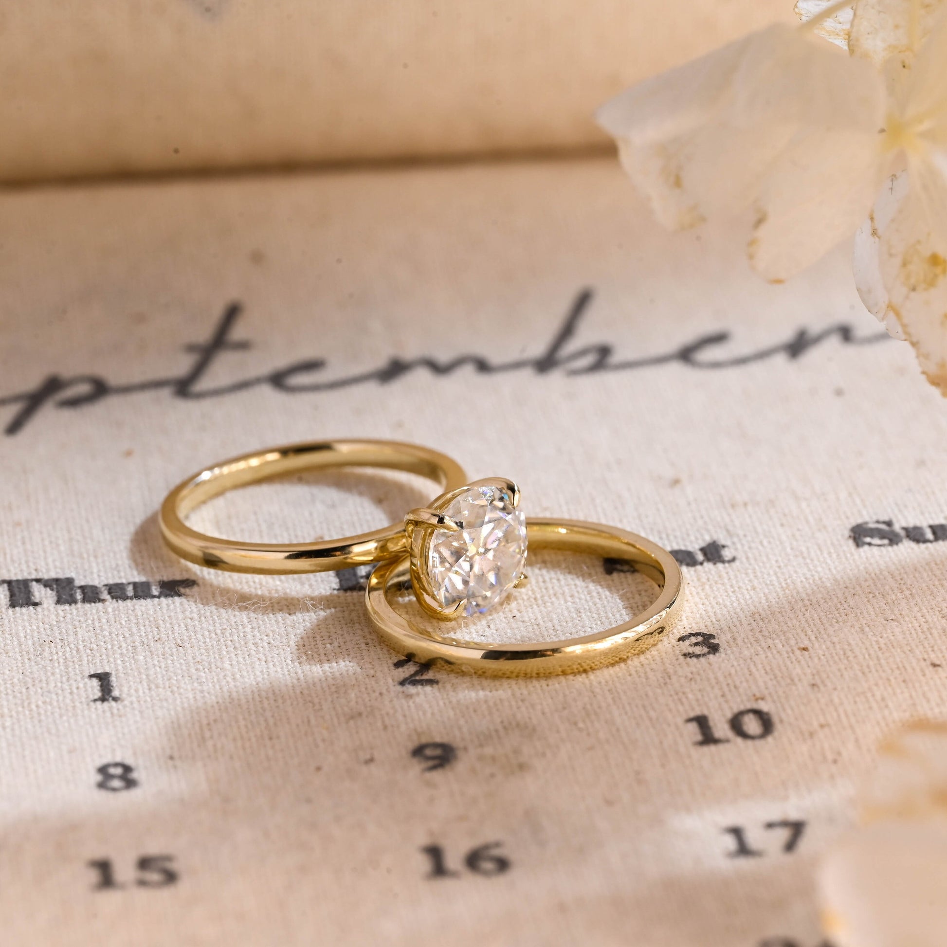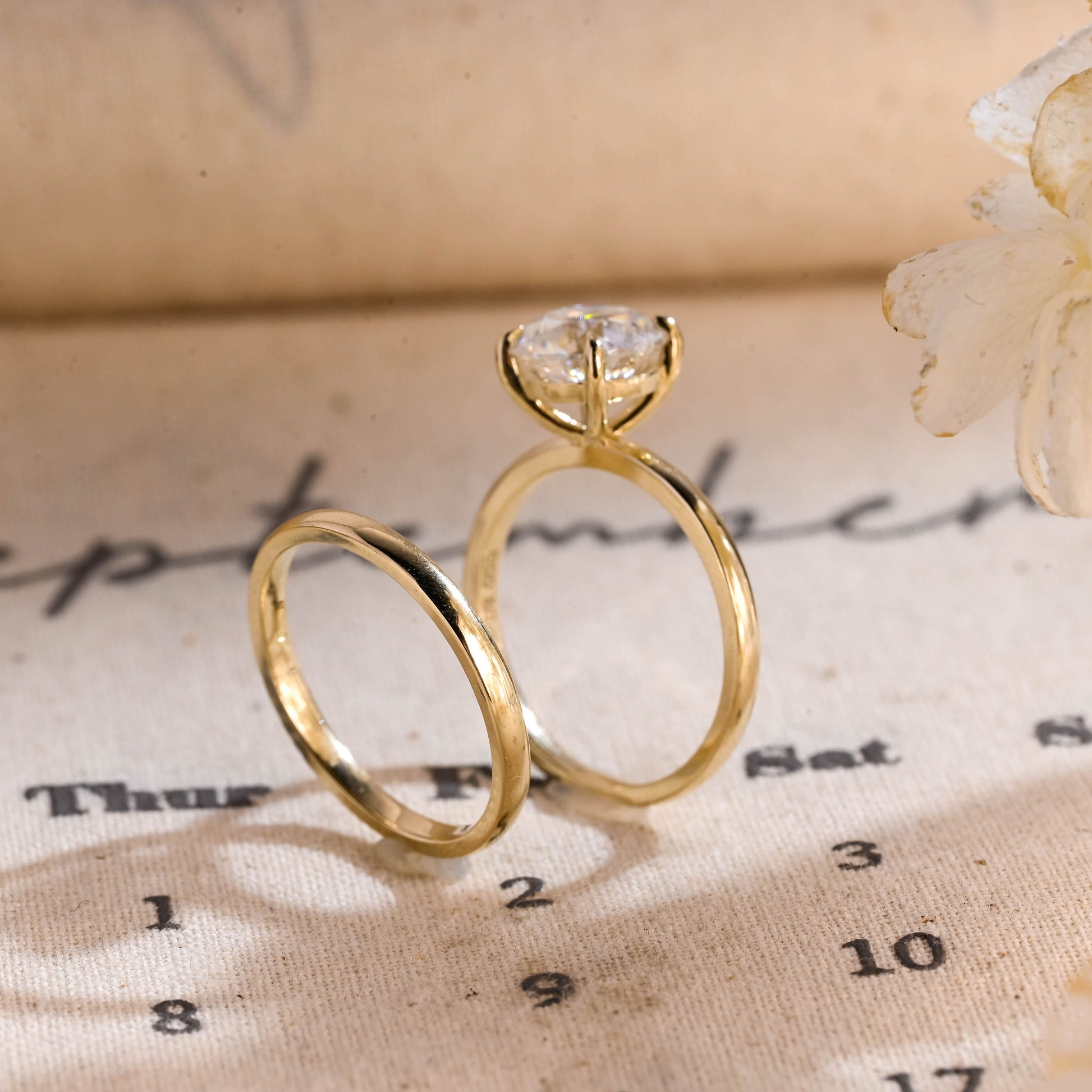 Solid Gold Round Moissanite Engagement Ring Set, Plain Band Bridal Ring Set for Women, Round Diamond Moissanite Wedding Ring Set, Ring Gifts