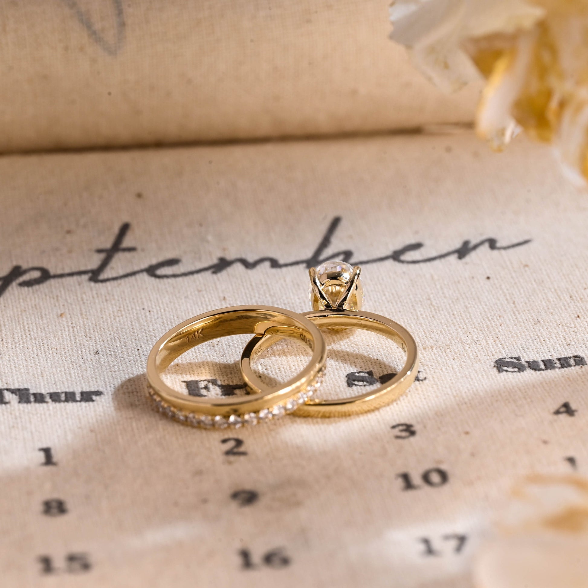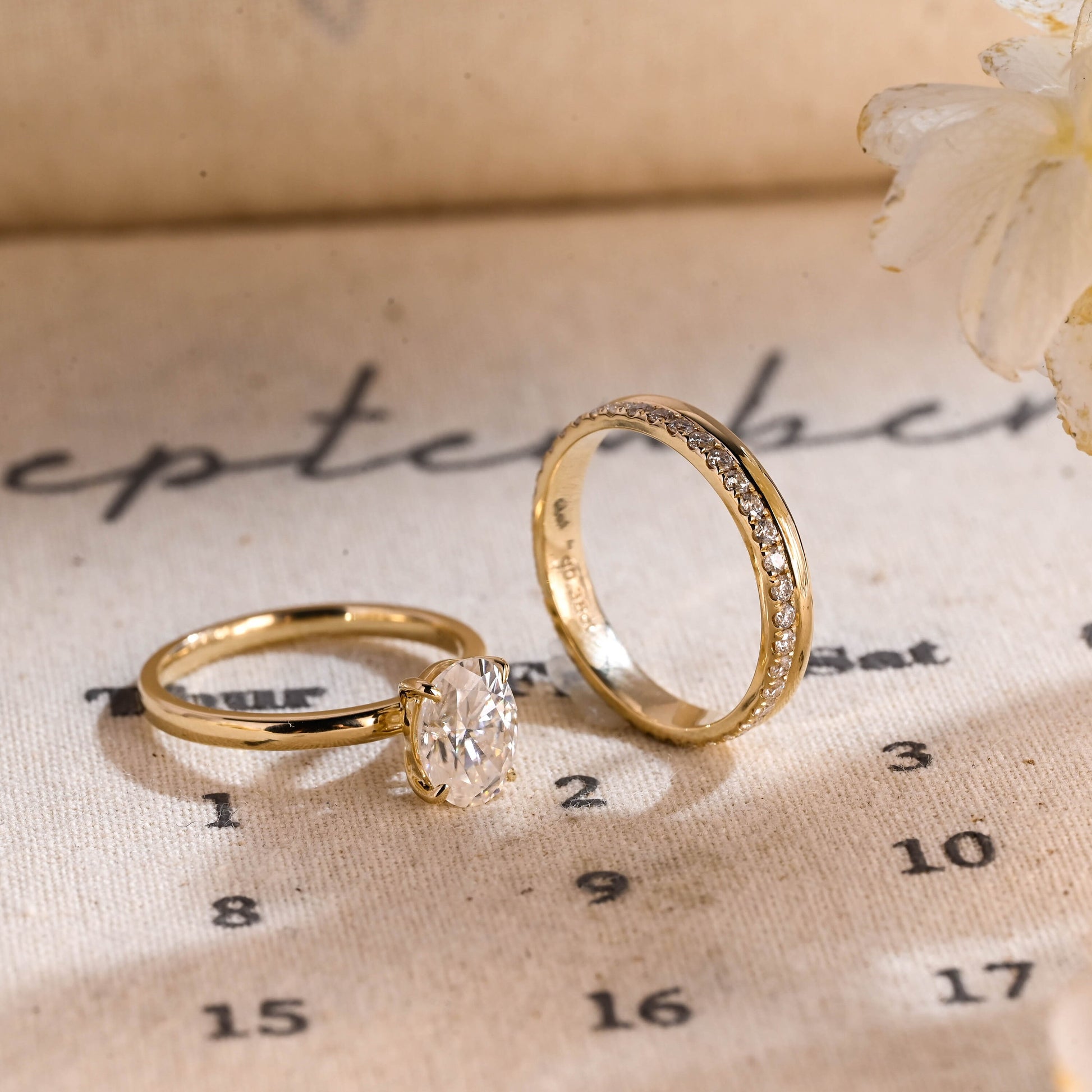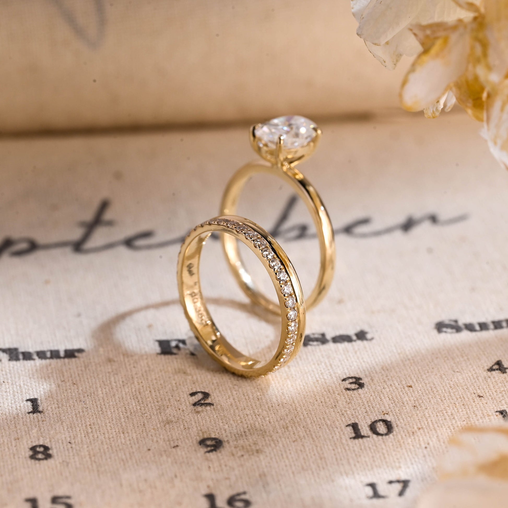 Solitaire Oval Moissanite Engagement Ring Set, Real Solid Gold Full-Eternity Round Moissanite Bridal Ring Set Wedding Ring Set for Women