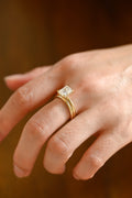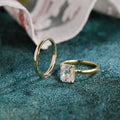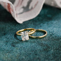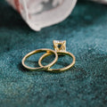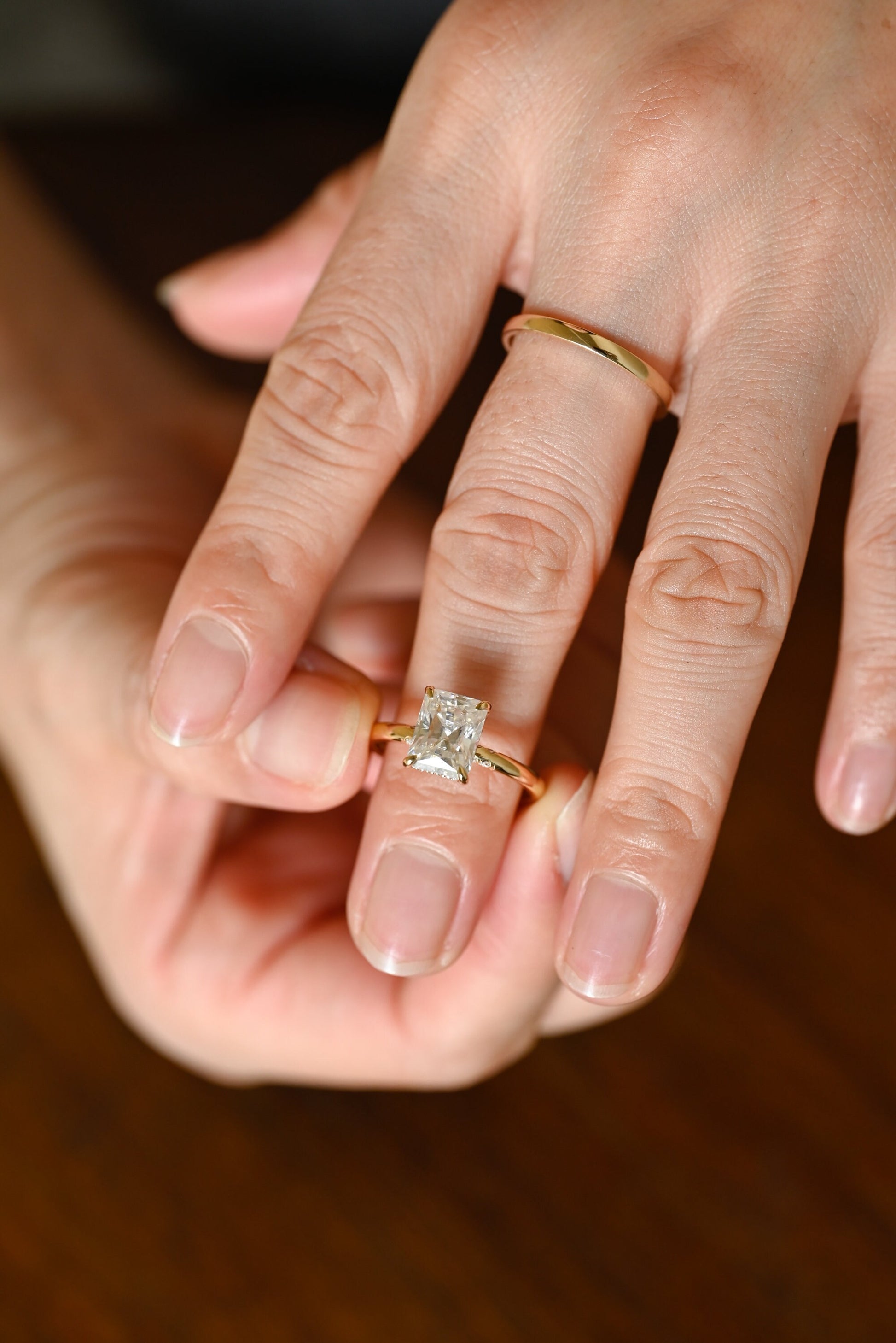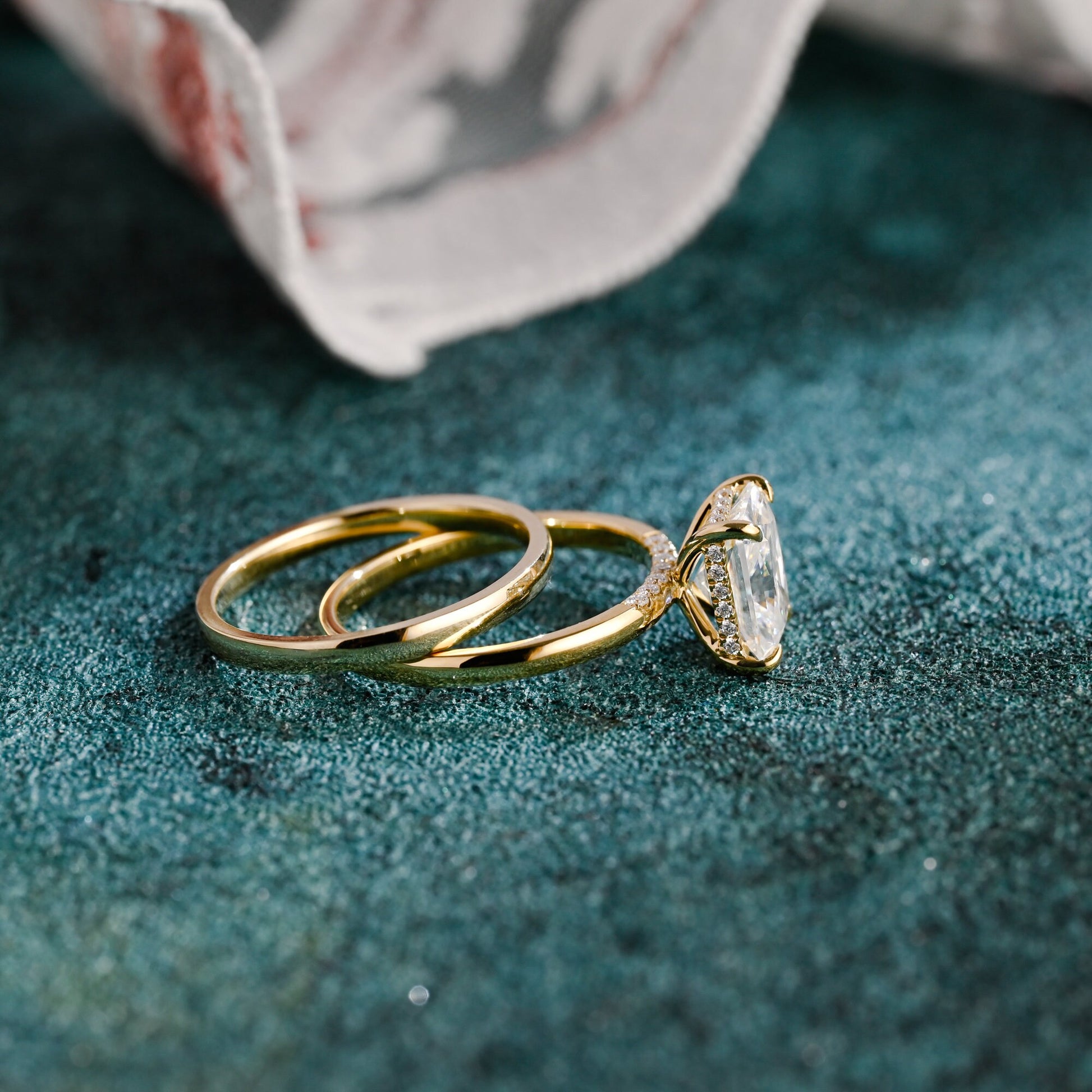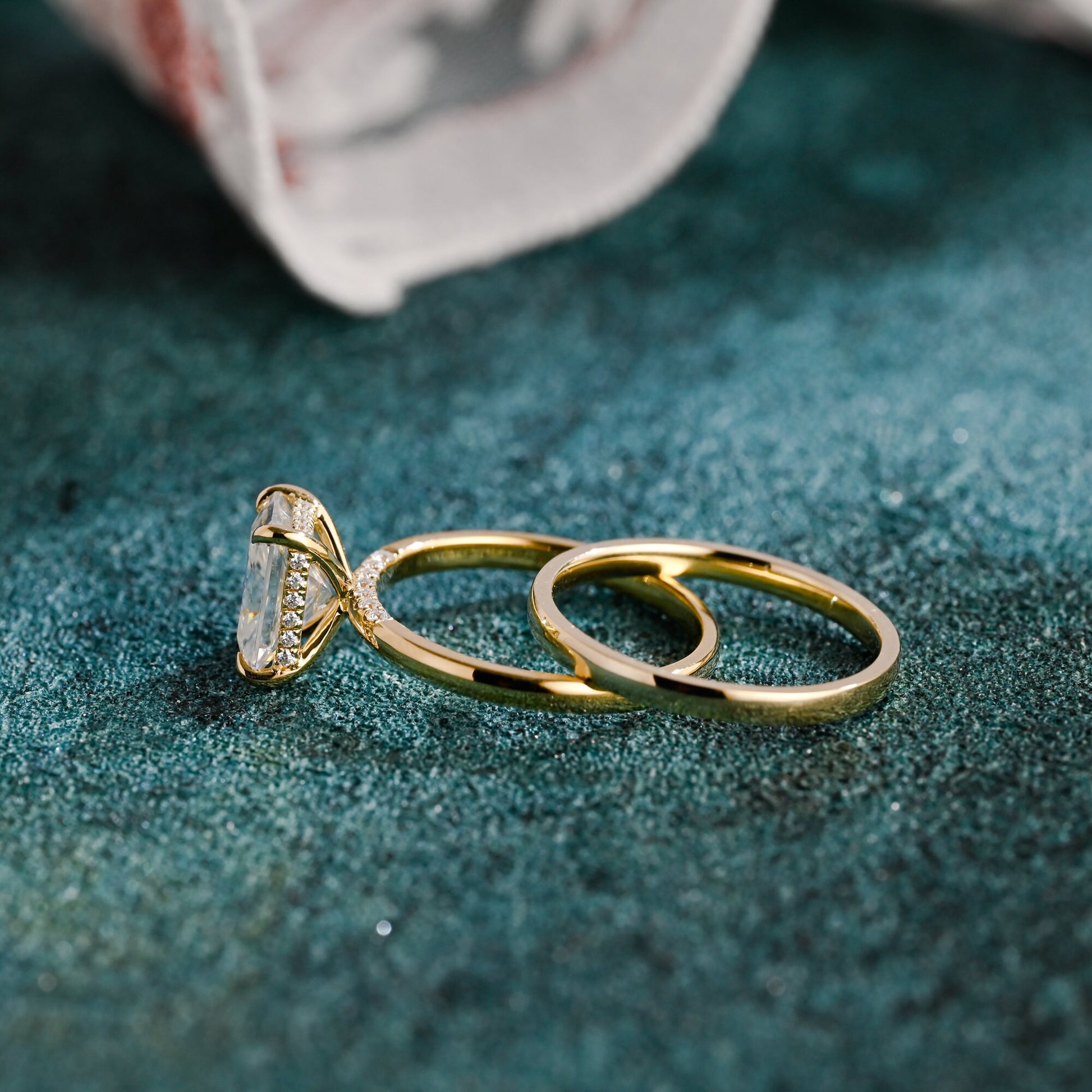 Solitaire Radiant Cut Moissanite Engagement Ring Set, Solid Gold Plain Band Hidden Halo Bridal Set, Engagement Anniversary Gift for Woman