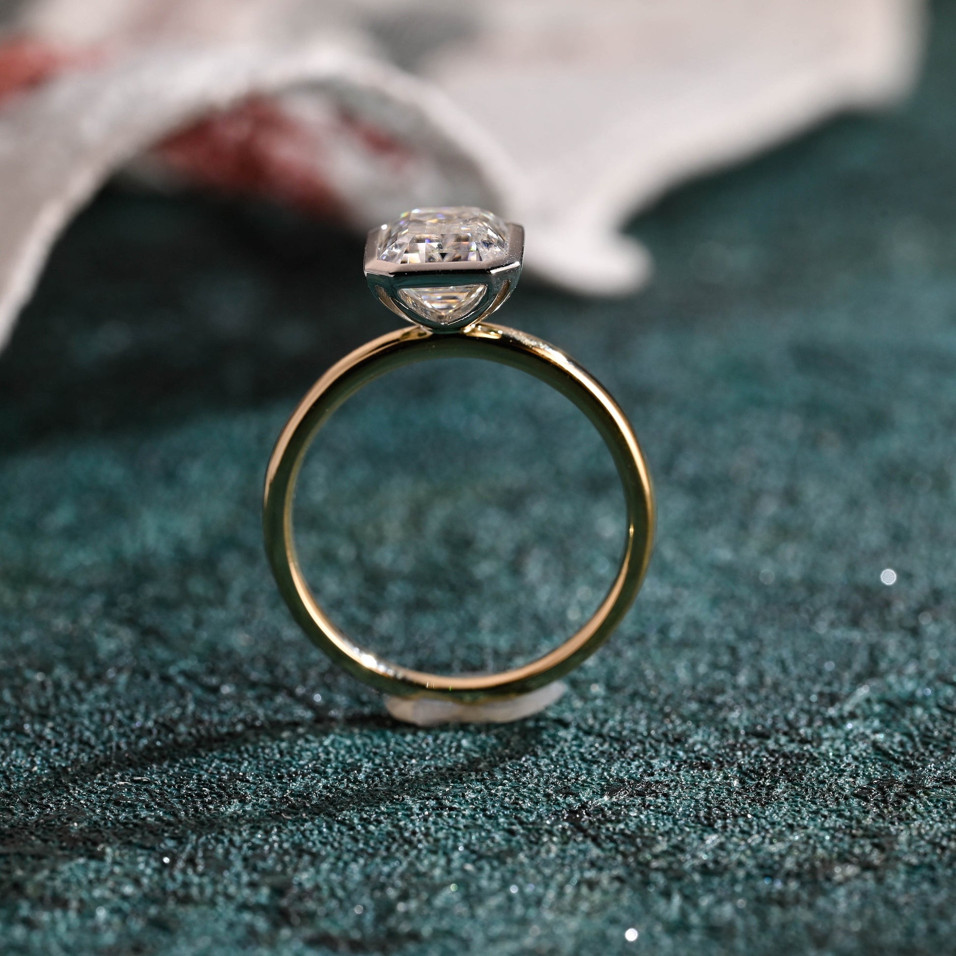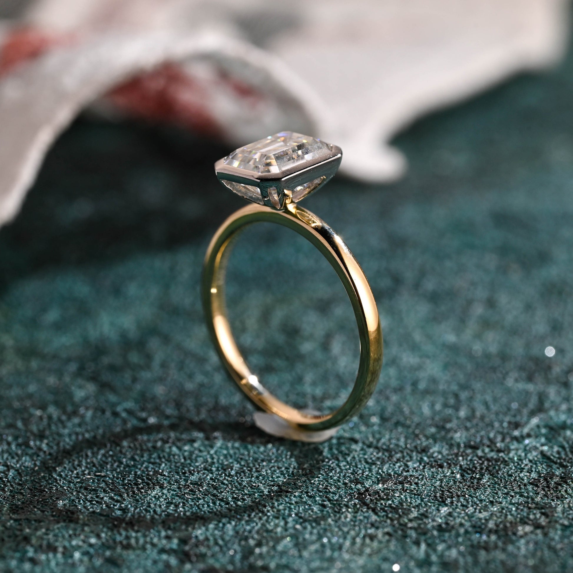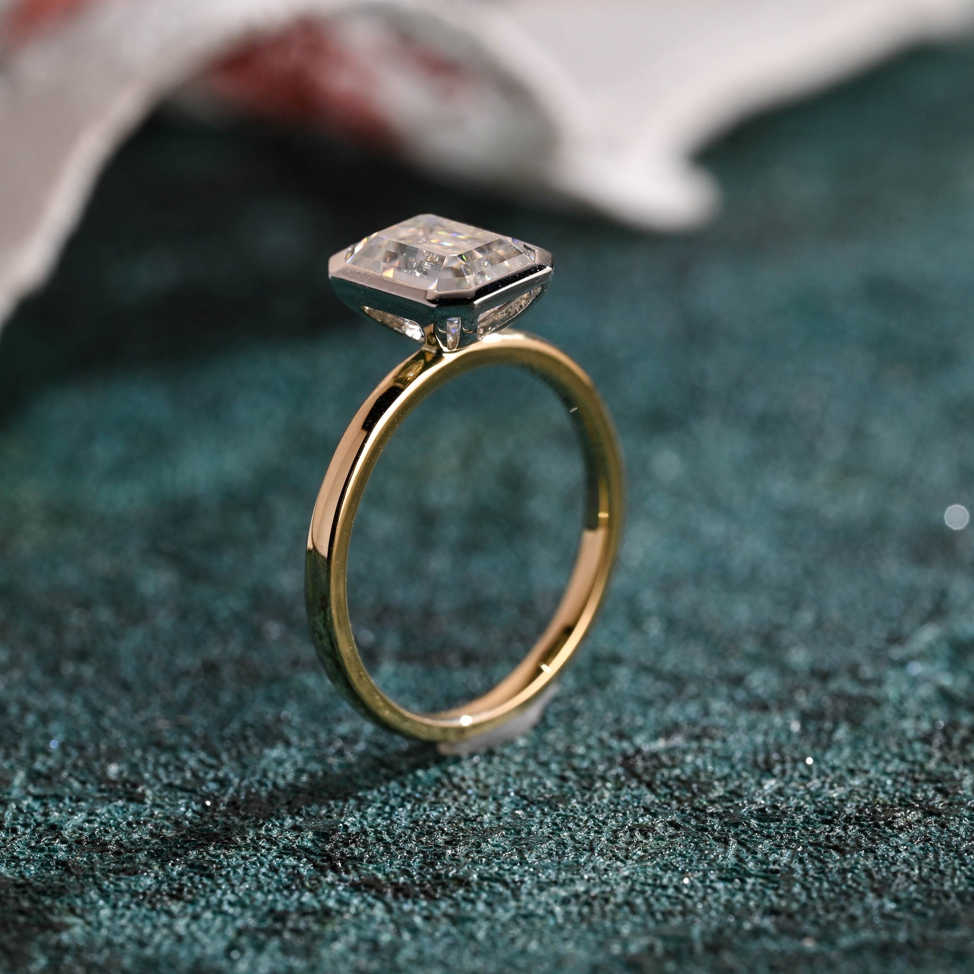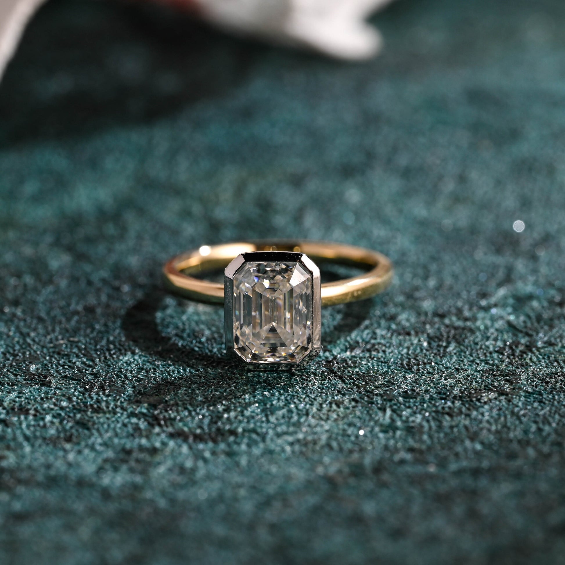 2.00ct Two Tone Bezel Set Emerald Cut Diamond Engagement Ring, Solitaire Emerald Ring, Gift for Women
